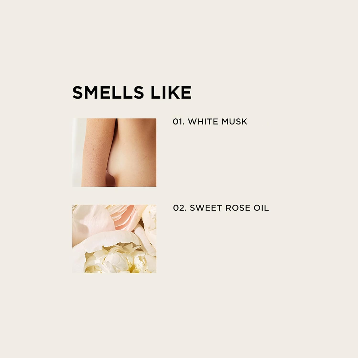 Layered Scent Profile – Top notes of naked skin + white musk, middle notes of sweet rose oil and base notes of white amber.