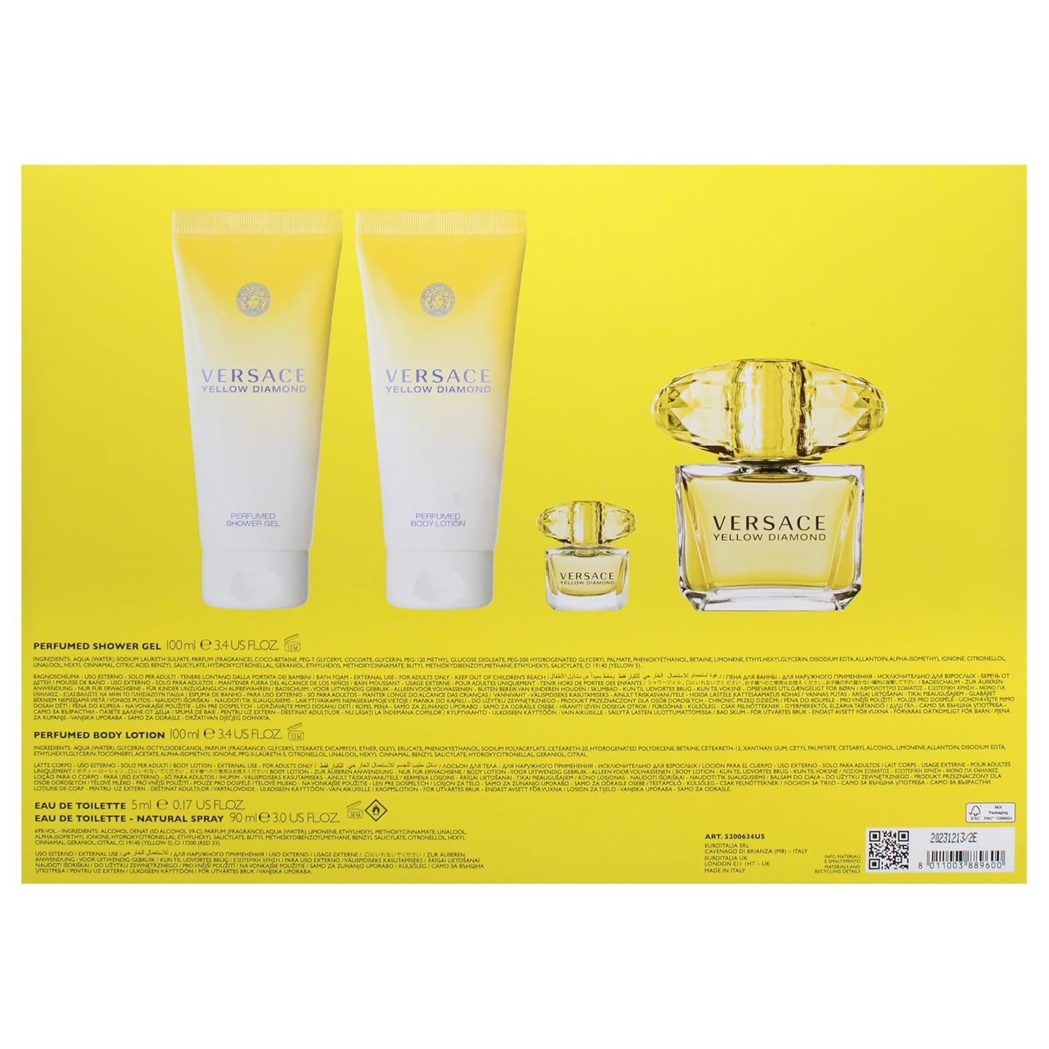 Versace Versace Yellow Diamond 3oz EDT Spray, 3.4oz Shower Gel, 3.4oz Body Lotion, 5ml EDT Rollerball Mini Women 4 Pc Gift Set
