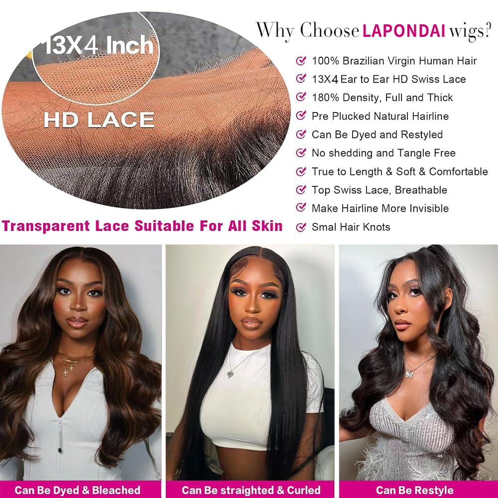 LAPONDAI Body Wave 13×4 Lace Front Wigs Human Hair Pre Plucked with Baby Hair Natural Black Color