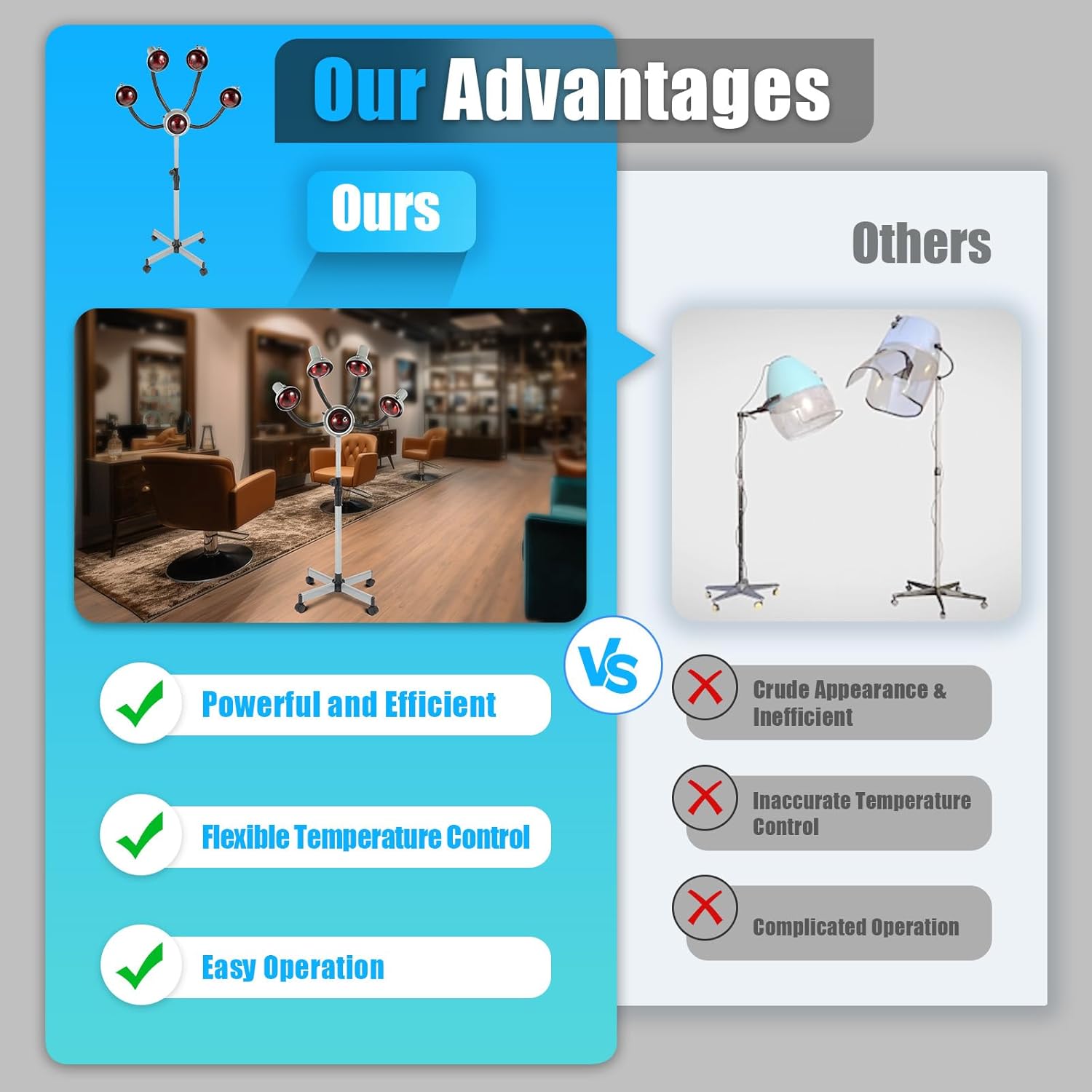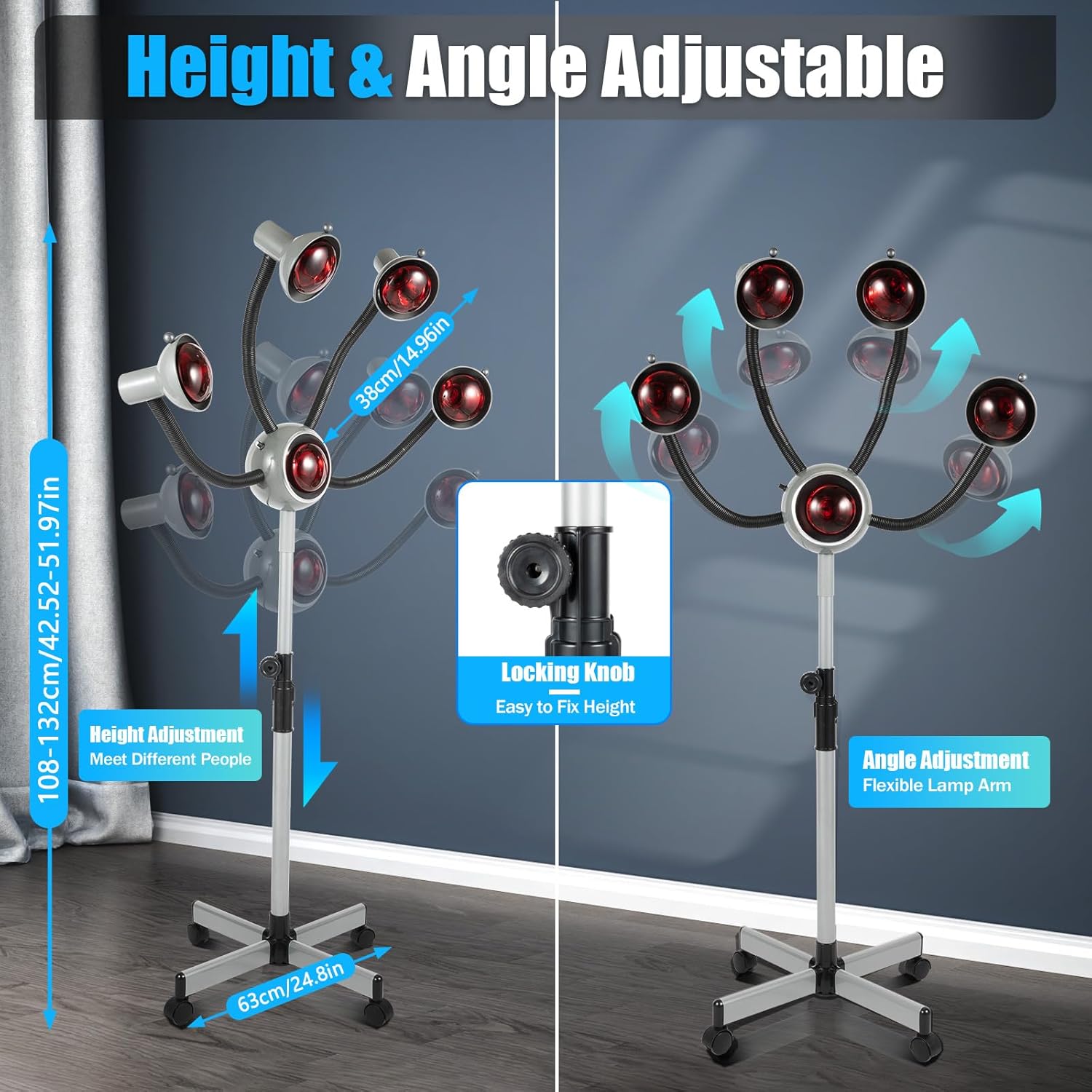 Height & Angle Adjustable: The stand can be adjusted in height from 42.52-51.97inch, and the arm of the lamp can be adjusted in angle at will, which is well adapted to customers of different heights and sitting postures, reduces the pressure on the neck and shoulders, and provides comprehensive heating and better hair care.