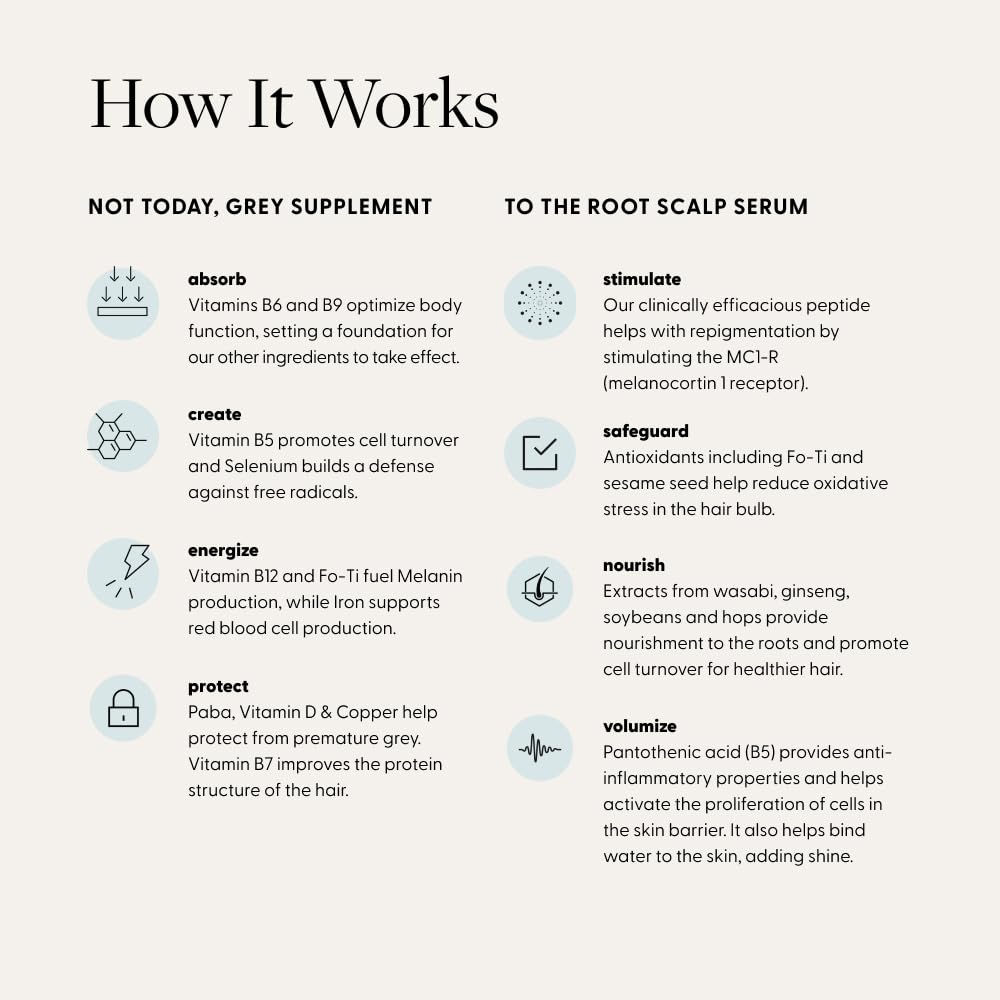 AID REPIGMENTATION IN EARLY GREY STAGES IN 3-6 MONTHS: The System by Arey tackles grey hair inside-out with Not Today, Grey (daily supplements) and outside-in with To The Root (a clean, oil-free, scent-free serum).