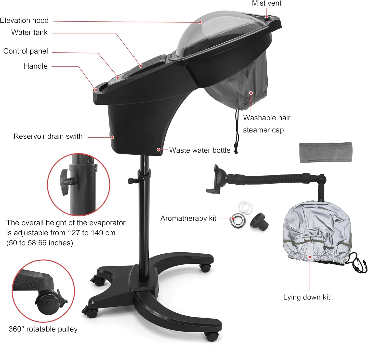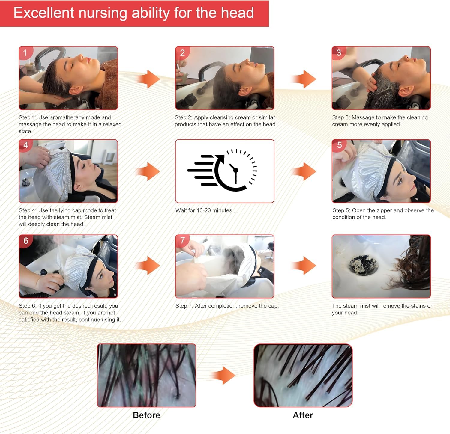 The hood accessories add lying function, aromatherapy function, open spray function, easy to do scalp clean, add new business to your shop. Hair steamer for shampoo bowl portable hair washing sink, can get the steam treatment for hair and face and hands, while doing treatment can add fragrance to the machine, get great scent along doing hair treatment.