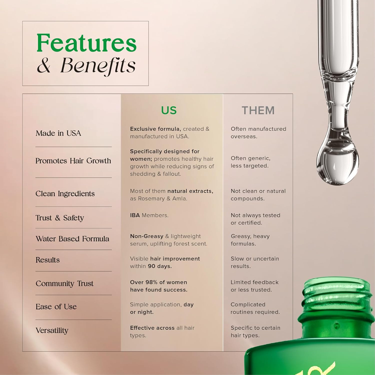 LAB TESTED & IBA CERTIFIED MEMBERS: Made in the USA, developed by specialists & rigorously tested under strict laboratory conditions, our hair serum for hair growth is member of the International Beauty Association (IBA). Trusted by over 100,000 women & men, this formula is tailored to nourish hair, promoting a healthy, thick, & shiny appearance. Paraben Free & Sulfate Free.