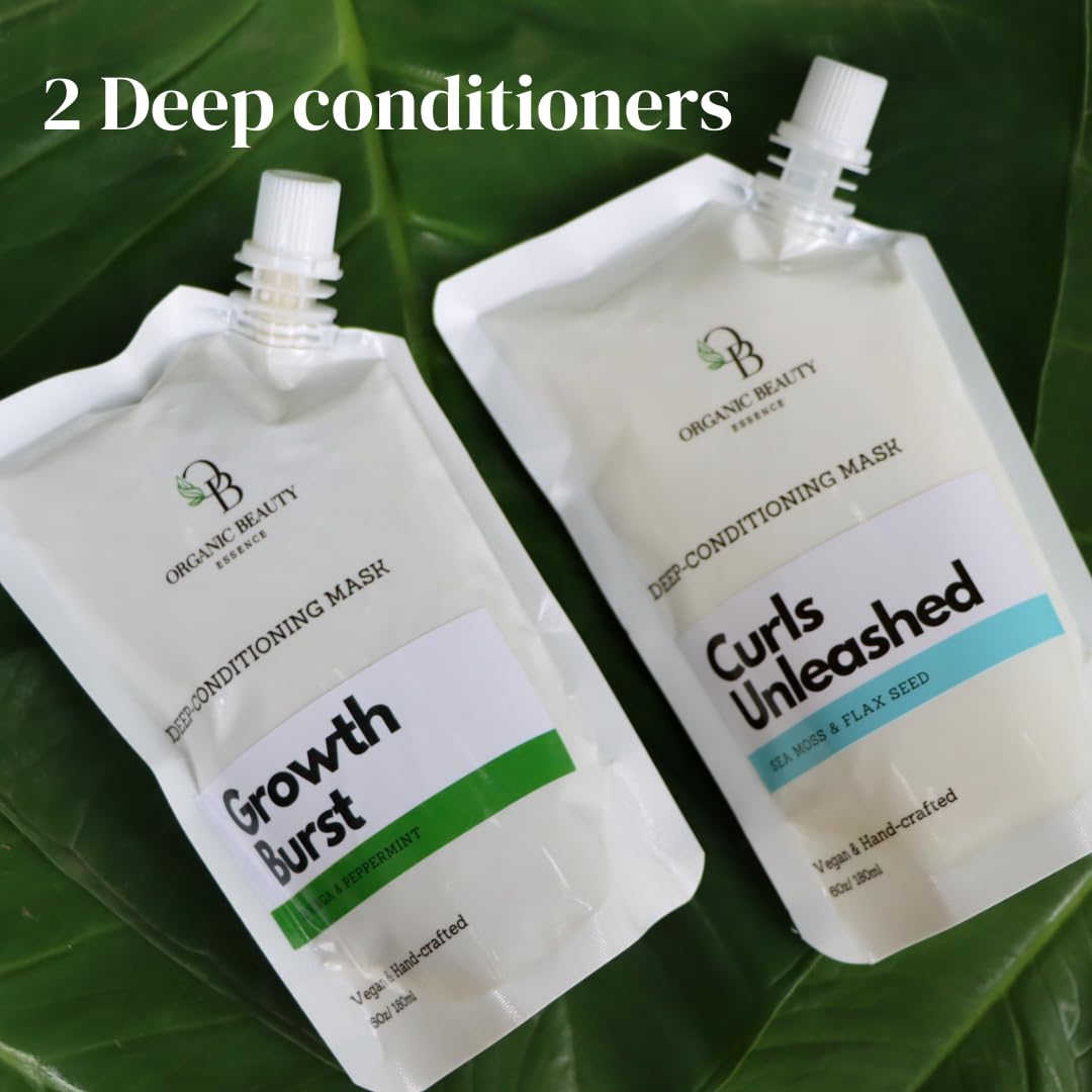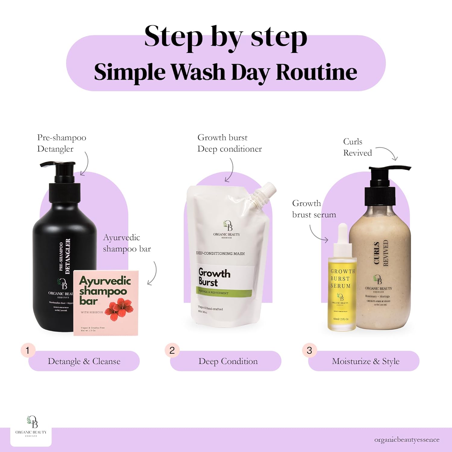 This Ultimate Washday Box is carefully curated with 6 full-sized vegan and organic hair-care products to take you through all your washday steps, from Detangling & Pre-poo to Shampoo, Deep Conditioning, Styling, and Scalp care. WHAT IS IN THE BOX? 1. The Organic Beauty Essence Marshmallow and Slippery Elm Detangler- Perfect for your pre-poo and detangling washday step. 2. Organic Beauty Essence Ayurvedic Moisturizing Shampoo Bar 3. Organic Beauty Essence PowerUp Deep Conditioning Treatment Mask 4. Organic Beauty Essence Growth Burst Deep Conditioning Treatment Mask 5. Organic Beauty Essence Curls Unleashed Styling Custard 6. Organic Beauty Essence Growth Burst Serum. The Happy Hair Box comes with a step-by-step guide that teaches you how to care for your curls, shorten your washday days, and help you achieve long, gorgeous curls in a very short time.