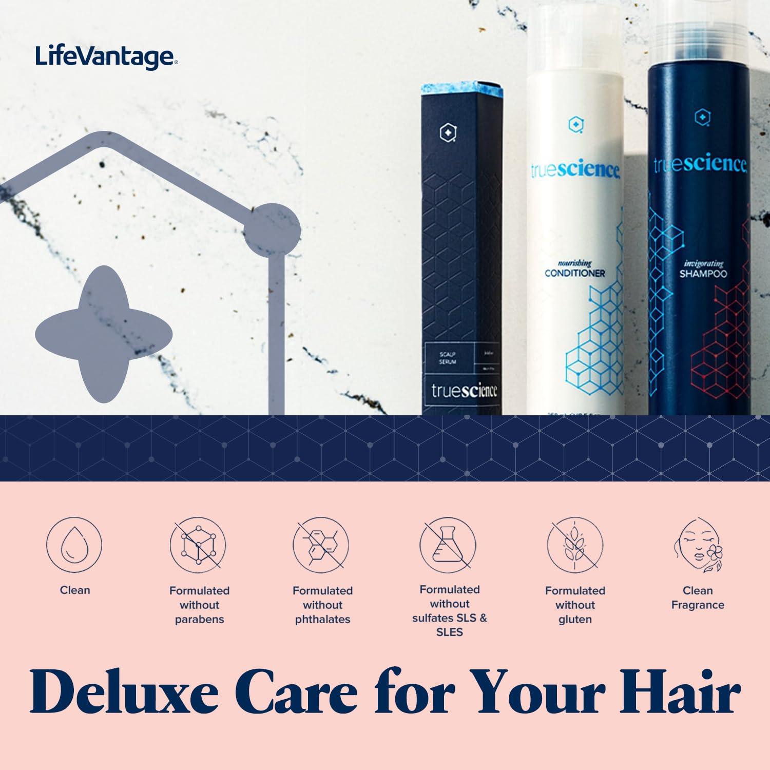 LifeVantage TrueScience Hair Care System Includes TrueScience Nourishing Hair Shampoo 250ml, Conditioner 250ml and Scalp Serum 50ml.