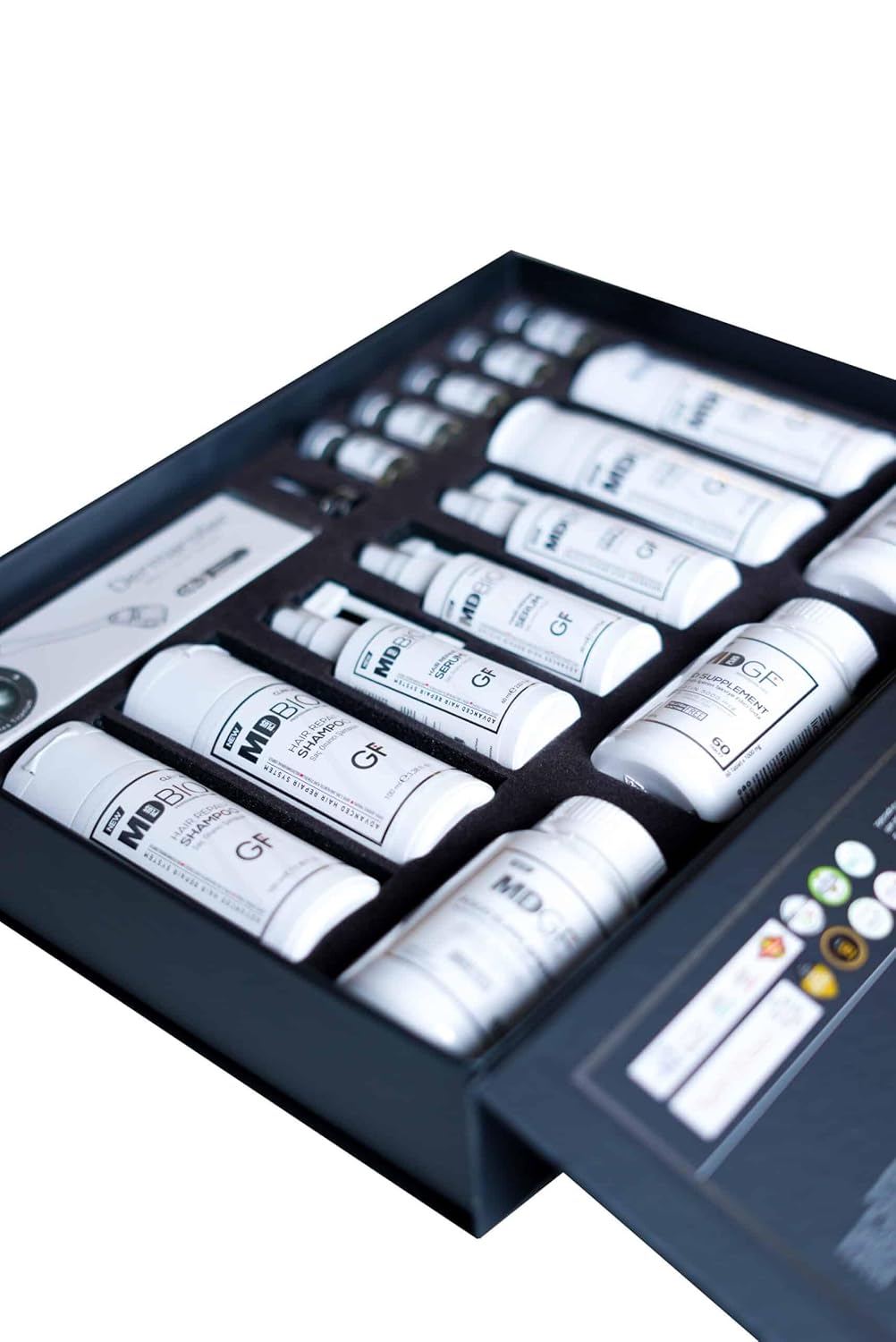 3-Month Hair Care Repair Set consists of 3 x Shampoo, 3 x Serum, 3 x Tablets, and 5 x Complex Meso Serum, designed to support a healthier scalp and hair appearance. This set also includes a scalp stimulation roller for enhanced care. A balanced hair routine and proper nourishment can contribute to thicker and fuller-looking hair