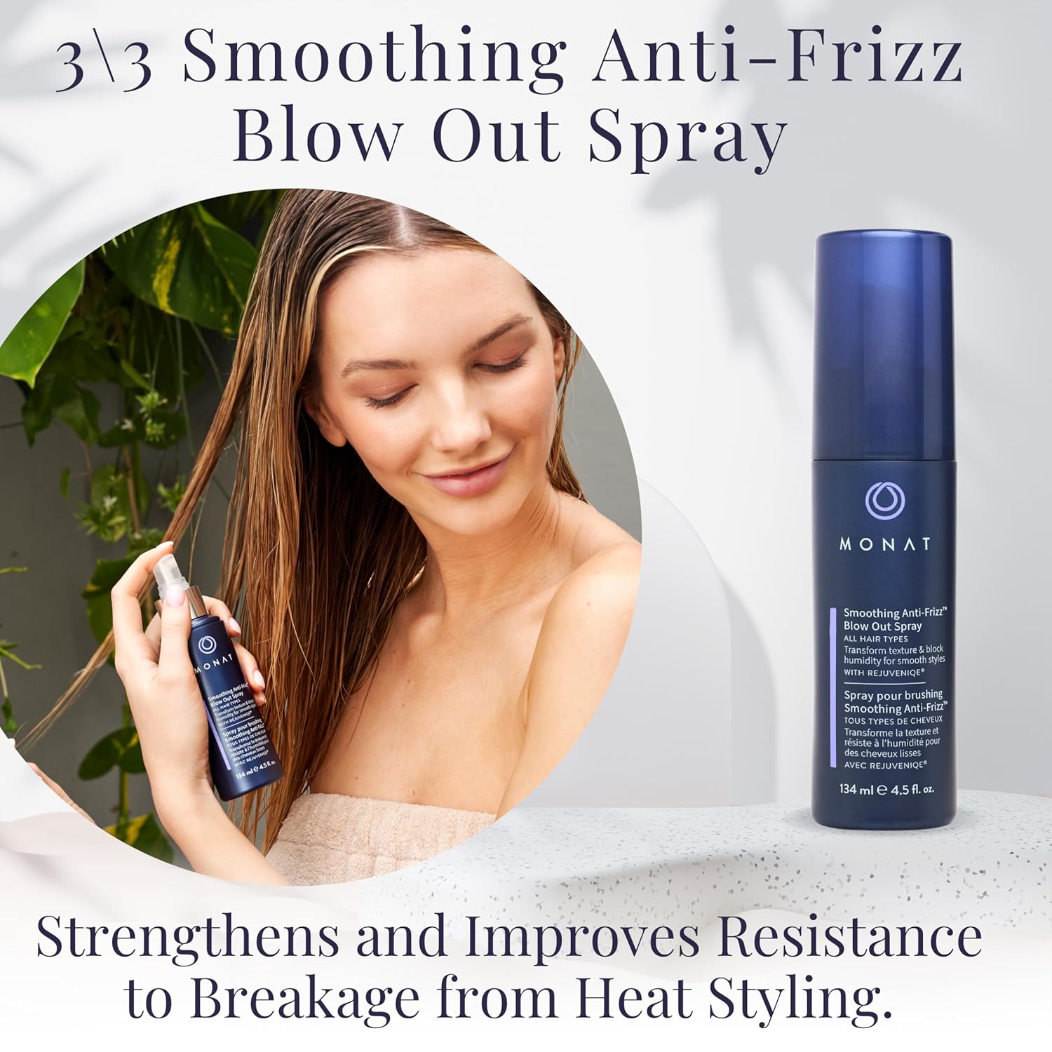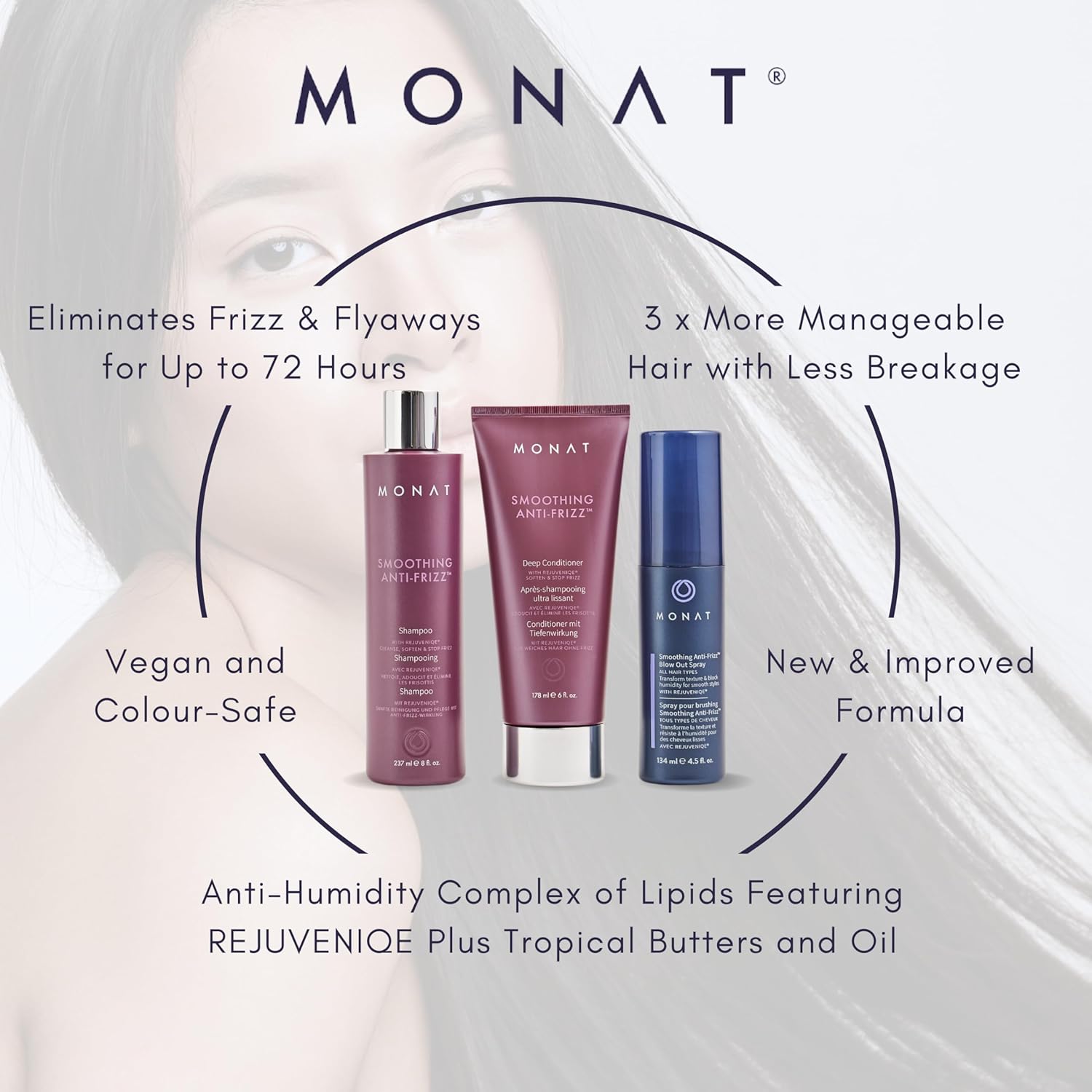 [All-ROUND FRIZZ CARE] – Tired of battling frizzy, unruly hair? Say goodbye to bad hair days and hello to sleek, salon-worthy locks with the MONAT Smoothing Anti-FrizzTM System which contains carefully selected products that are designed to keep your locks healthy and vibrant.