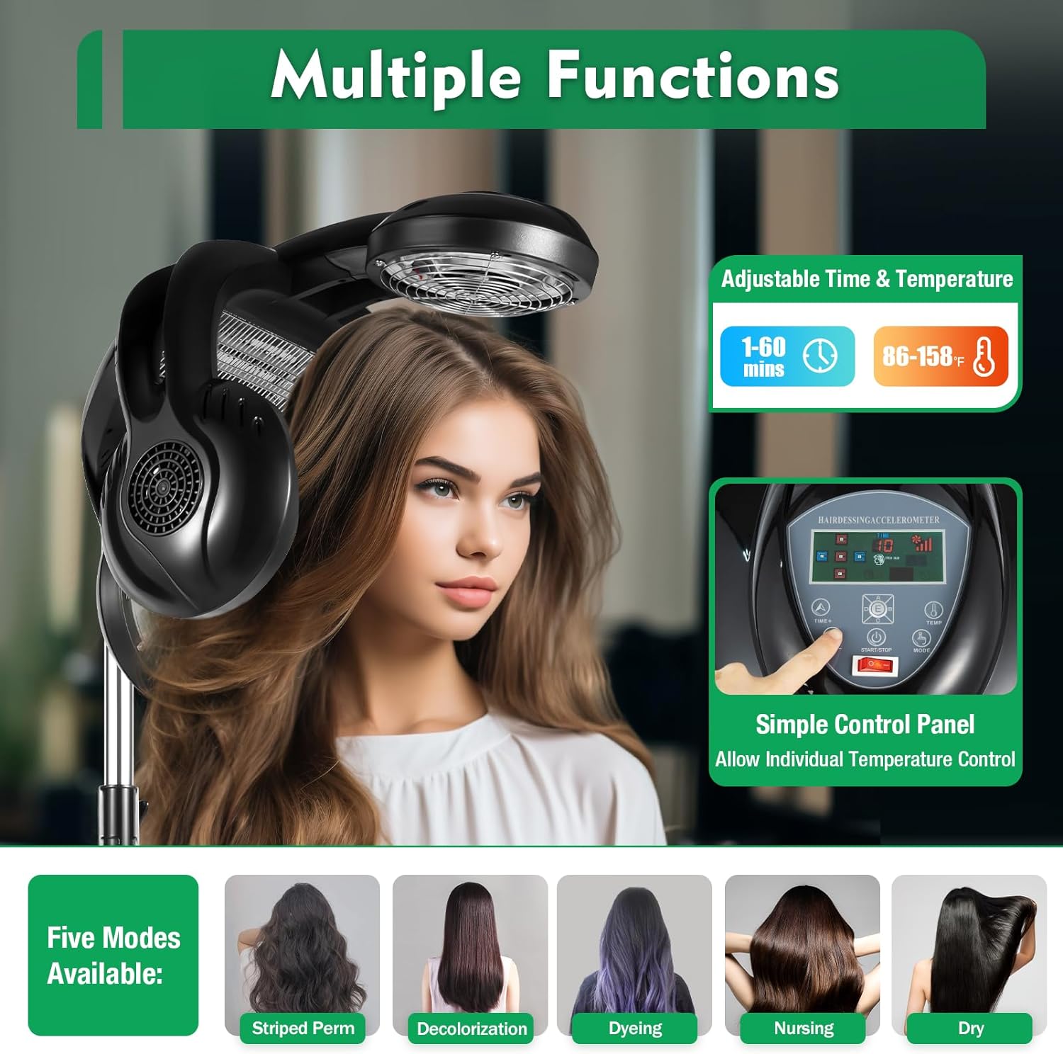 【Versatile Functionality】Offering five distinct modes – striped perm, decolorization, dyeing, nursing, and drying – this hair dryer caters to a wide range of styling needs. The ability to adjust time and temperature settings independently for each mode provides unparalleled flexibility, allowing you to achieve the perfect look every time.
