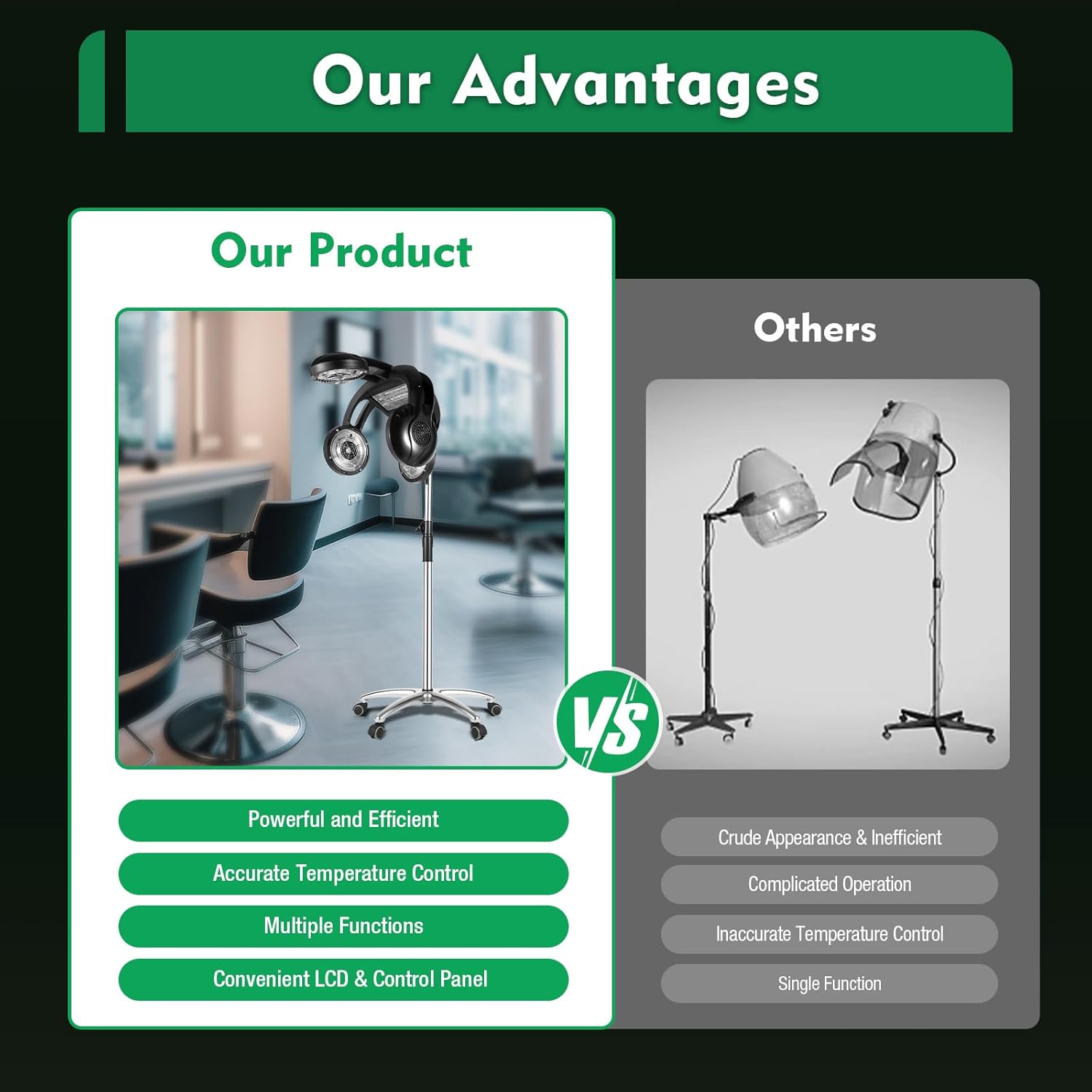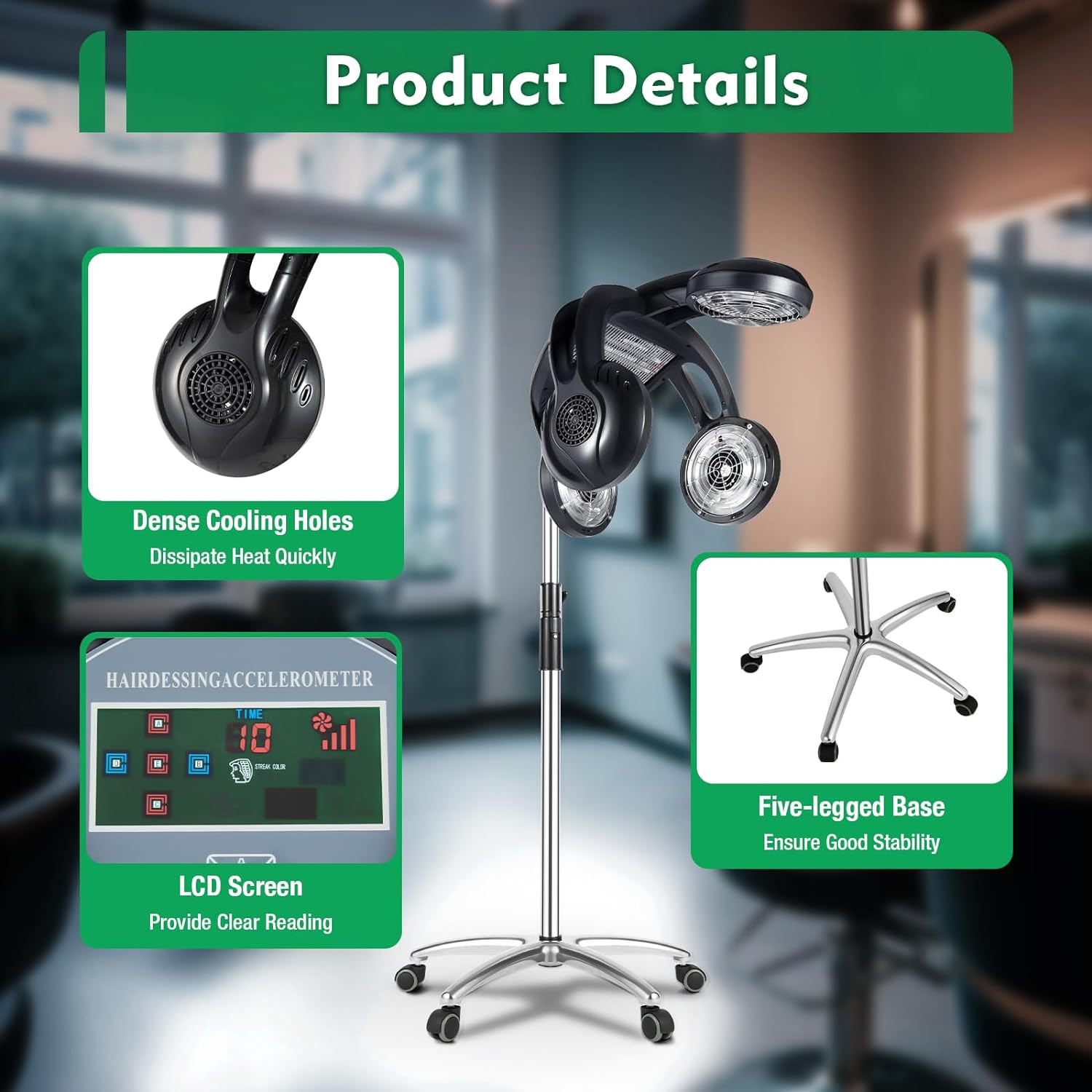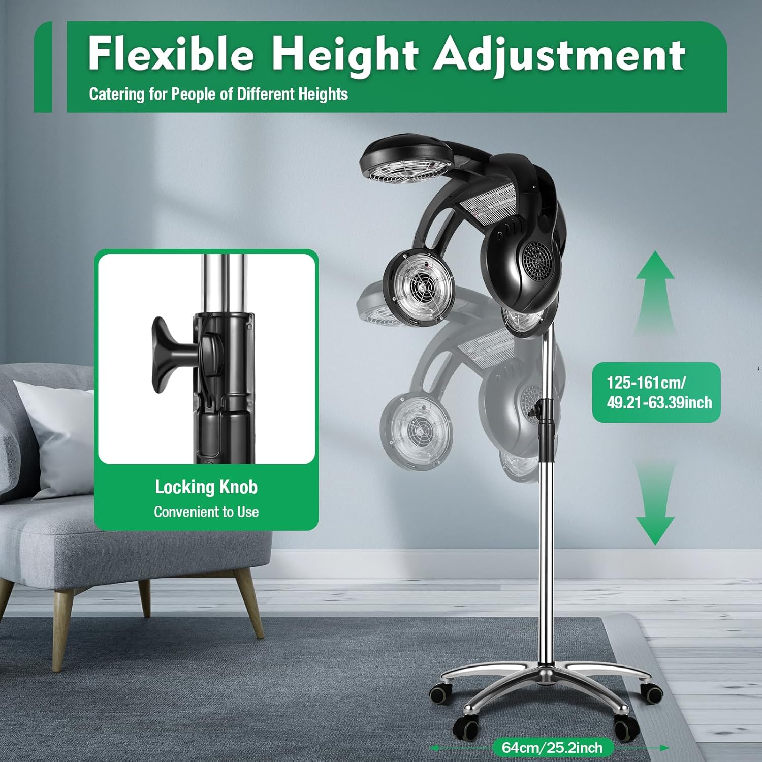 【Ergonomic and User-Friendly Design】Adjustable from 49.21 to 63.39 inches, our hair dryer accommodates users of all heights, ensuring comprehensive heating and optimal hair care. The five PU universal wheels enable smooth and noiseless mobility, while the anti-scald guard rail, long power cord, and advanced safety features guarantee a safe user experience.