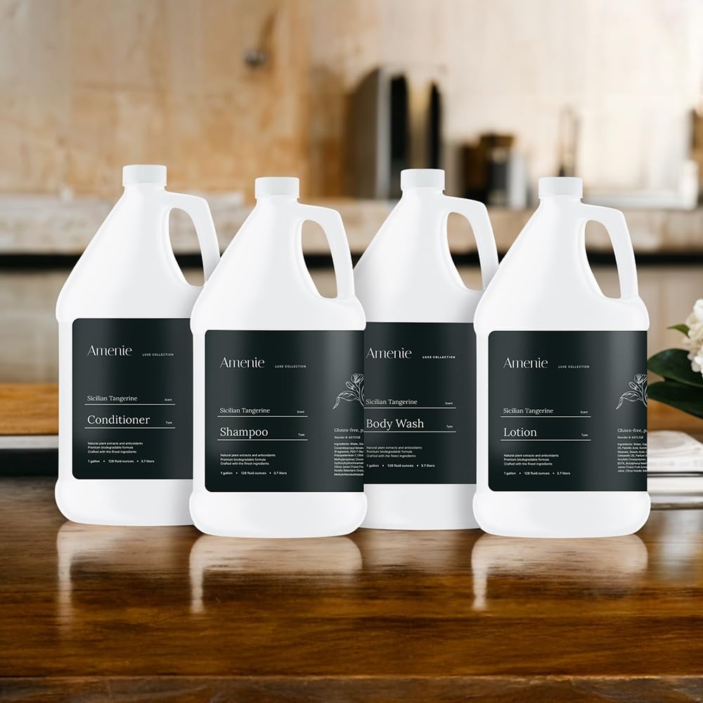 Amenie Sicilian Tangerine Conditioner offers a luxurious, hydrating experience, designed to replenish and soften hair with its invigorating citrus fragrance. Enriched with Olive Oil, Sunflower Oil, and Aloe Barbadensis Leaf Juice, this conditioner provides intense moisture and restores shine while protecting the hair from environmental stressors. This conditioner helps to smooth and untangle hair, leaving it soft, healthy, and easy to manage. Ideal for all hair types, it helps maintain your hair’s natural moisture while adding a refreshing citrus scent to your daily routine. Our shampoo is made in Canada and is designed for hotels, spas, and high-volume settings. The Amenie Sicilian Tangerine Conditioner is available in a single and 4-gallon sizes, making it an economical and sustainable choice for large venues. This bulk packaging allows for easy dispenser refills, reducing waste and ensuring your guests always have access to high-quality, indulgent hair care. Enhance your amenities with Amenie’s premium bath products, crafted to deliver a superior blend of indulgence and sustainability. Perfect for creating a memorable guest experience.
