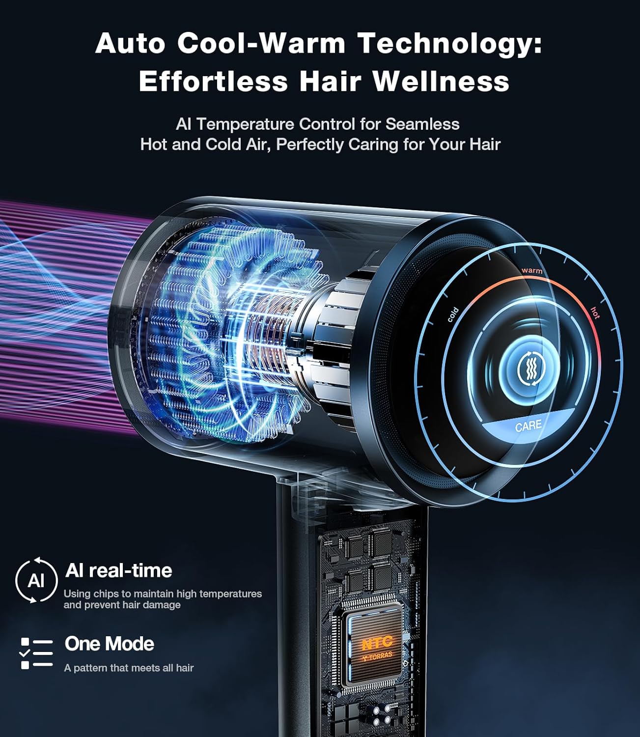 [Tailored Care at Your Fingertips] The TORRAS STREAM Hair Dryer offers two primary modes: the normal mode for quick drying to save you time, and the hair care mode with continuous temperature control that alternates between warm and cool air to protect your scalp and hair. The smart display makes it easy to see and adjust your settings, allowing you to effortlessly choose the perfect mode, temperature, and airflow for your styling needs.