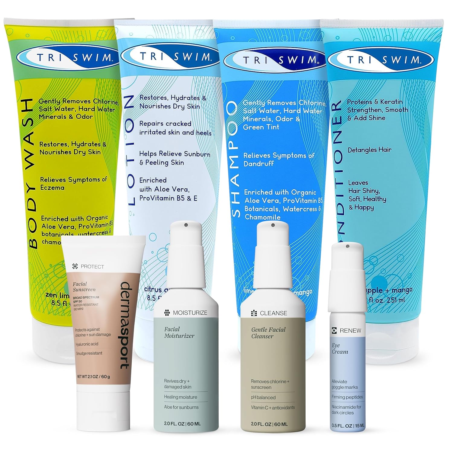 TRISWIM Hair & Body Care: Features salon-quality swim shampoo (8.5oz) , swim conditioner (8.5oz), chlorine removal body wash (8.5oz), and swimmers lotion (8.5oz). Enriched with Aloe Vera, Pro-Vitamin B5, Chamomile, and Watercress. Provides deep hydration, soothes irritation, and revitalizes hair and skin after exposure to chlorine and other harsh elements.
