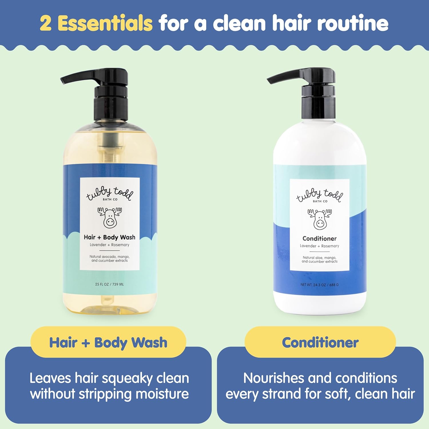 EASY 2-STEP BATH TIME ROUTINE: Lather Hair + Body Wash onto damp hair and skin for a deep but gentle clean. Follow with our Conditioner, applying a quarter-sized amount to the ends of wet hair. Leave for three minutes before rinsing with warm water for silky soft, tangle-free hair.
