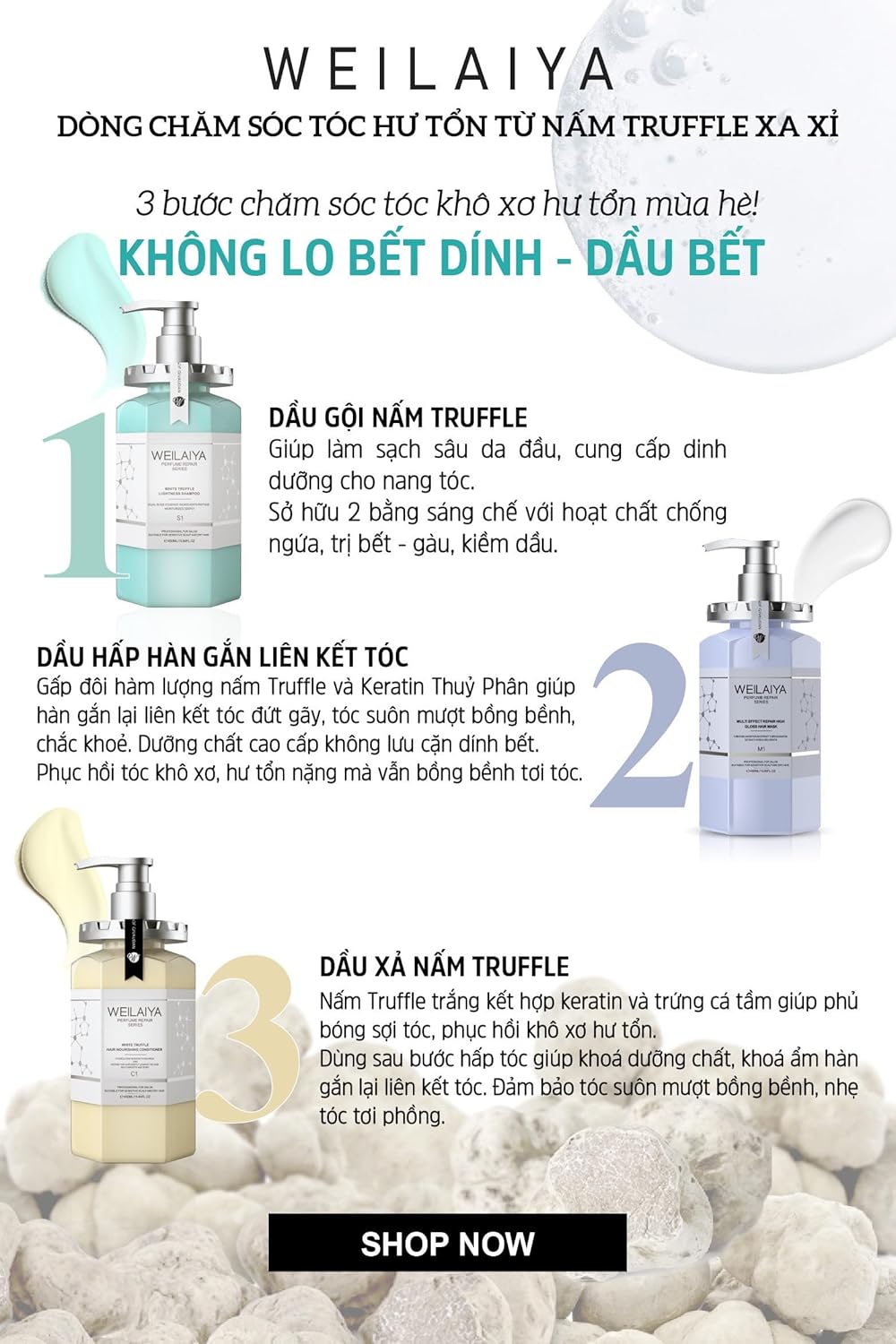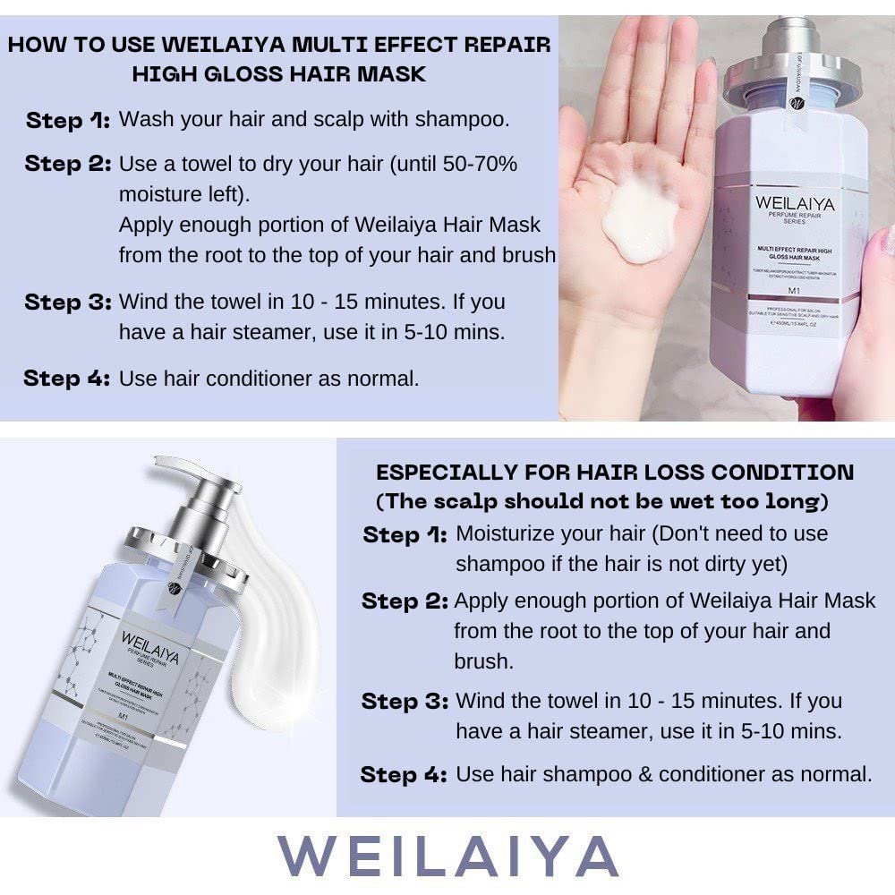 👉🏻WEILAIYA WHITE TRUFFLE LIGHTNESS SHAMPOO PRODUCT DESCRIPTION:Contains Tuber Magnatum Extract, Hydrolyzed Keratin and dual rose essence ingredients 1, repairs damaged hair, nourishes and moisturizes deeply, rich and fine foam, cleanses the scalp gently, leaving hair fresh and clean. The addition of Argania Spinosa Kernel Oil and peptide ingredients 2, soothes and nourishes the scalp, improves hair gloss, and makes hair soft and elastic. 👉🏻WEILAIYA WHITE TRUFFLE HAIR NOURISHING CONDITIONER PRODUCT DESCRIPTION:Contain tuber magnatum extract, to nourish and repair the hair deeply, leaving the hair silky smooth and shiny, contain hydrolyzed keratin and argania spinosa kernel oil, which nourishes the hair roots, hydrates and balance water and oil of the hair, and reproduces soft and moisturized hair. 👉🏻WEILAIYA MULTI EFFECT REPAIR HIGH GLOSS HAIR MASK PRODUCT DESCRIPTION: Recommended by senior hair stylists, select multiple plant extracts such as black truffle, white truffle and hydrolyzed keratin hair care formula, deeply repair dry and frizzy damaged hair, rebuild hair structure, smooth frizz, repair hair core, carefully Take care of your hair, give it a lustrous glow, and leave it with an elegant and charming fragrance.