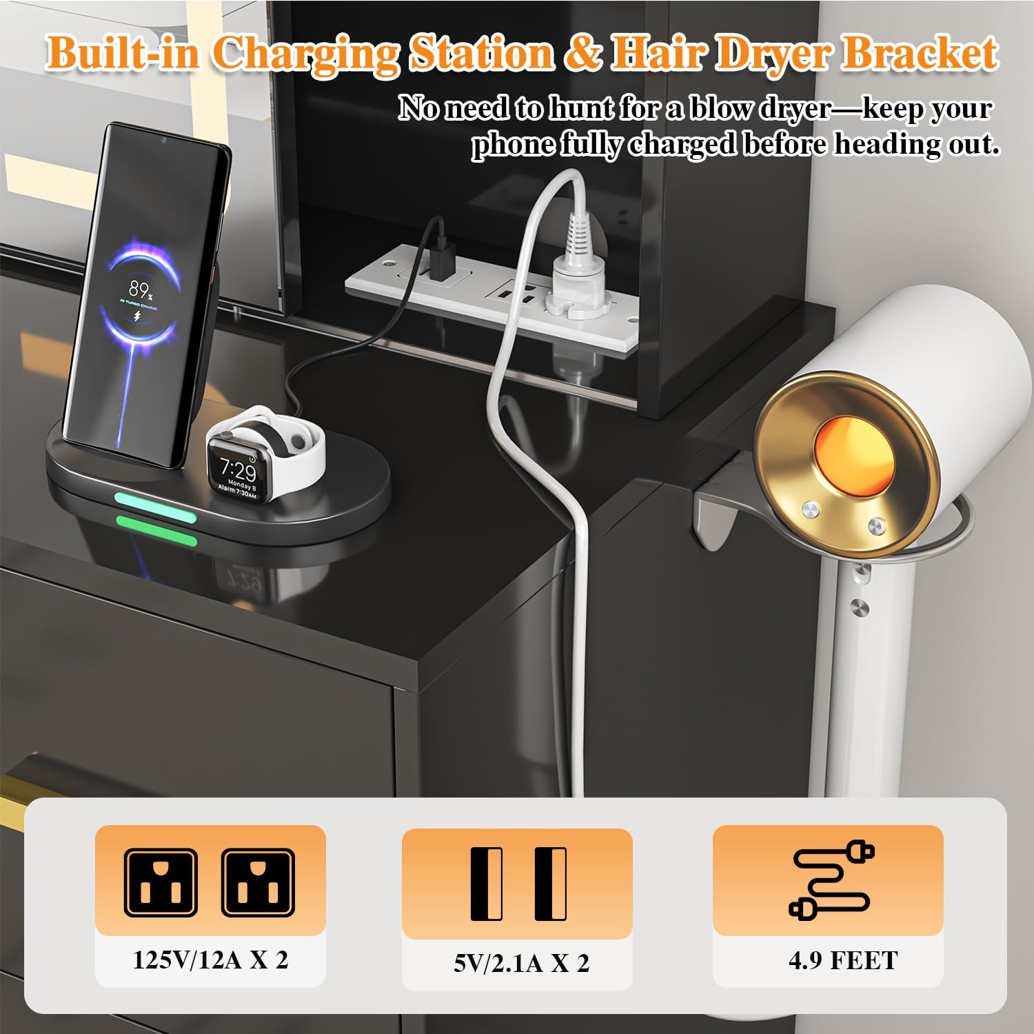 【Convenient Charging Station】The makeup desk is equipped with 2 USB ports and 2 AC power outlets, eliminating the need for extra power strips and preventing cable clutter. You can easily charge your phone while doing your makeup or working, ensuring you never leave home with a low battery. The fixed hairdryer holder also makes it convenient to find your hairdryer when you need it, saving you time and hassle
