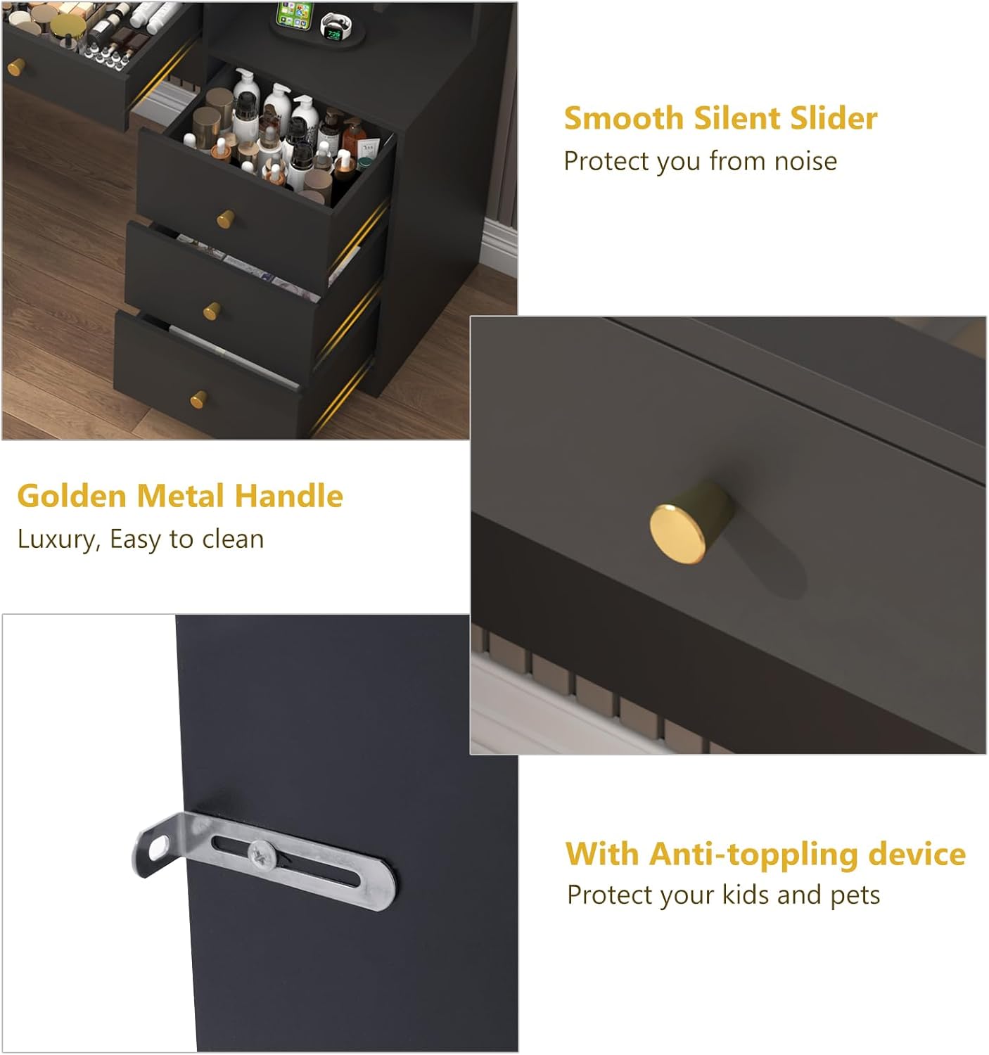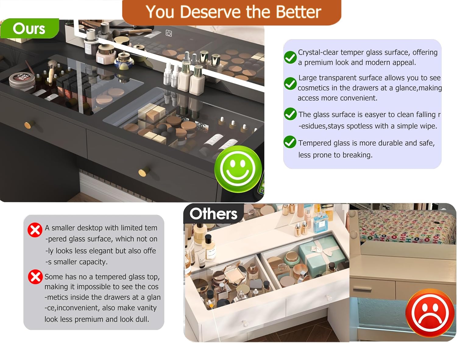 Large Glass Desktop:The Tempered glass desktop design can not only clearly view of the items stored in the drawer, no longer need to worry about finding the items, but also make the vanity looks more expensive and advanced.