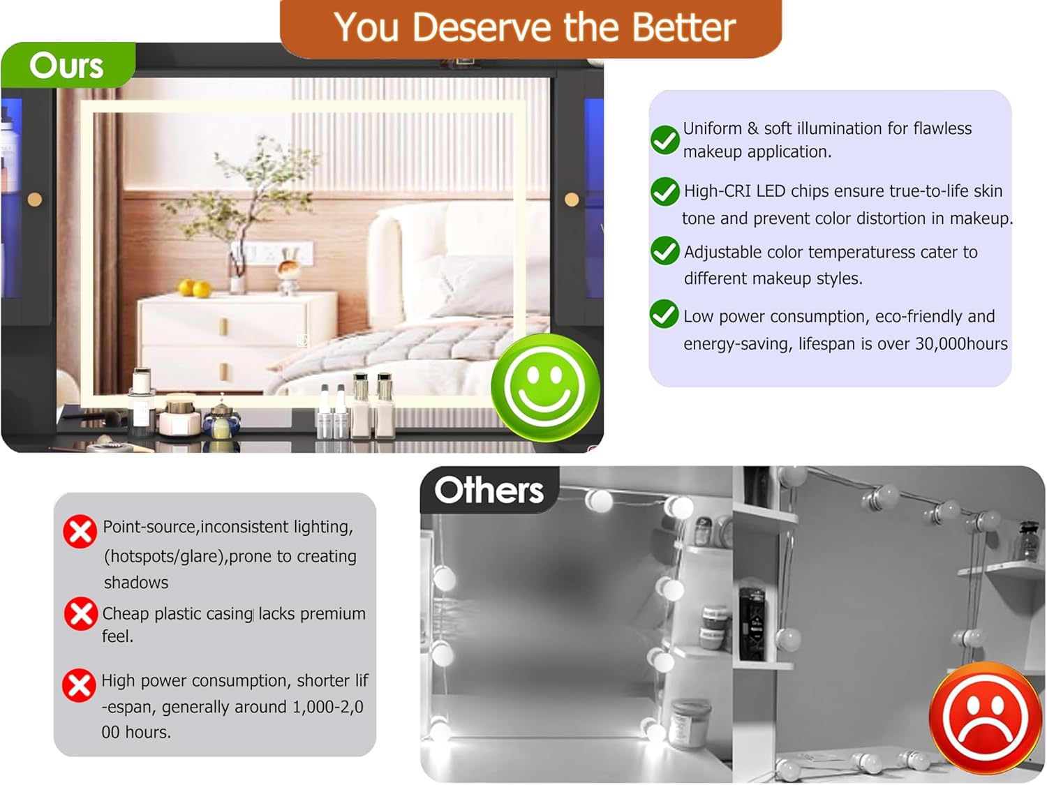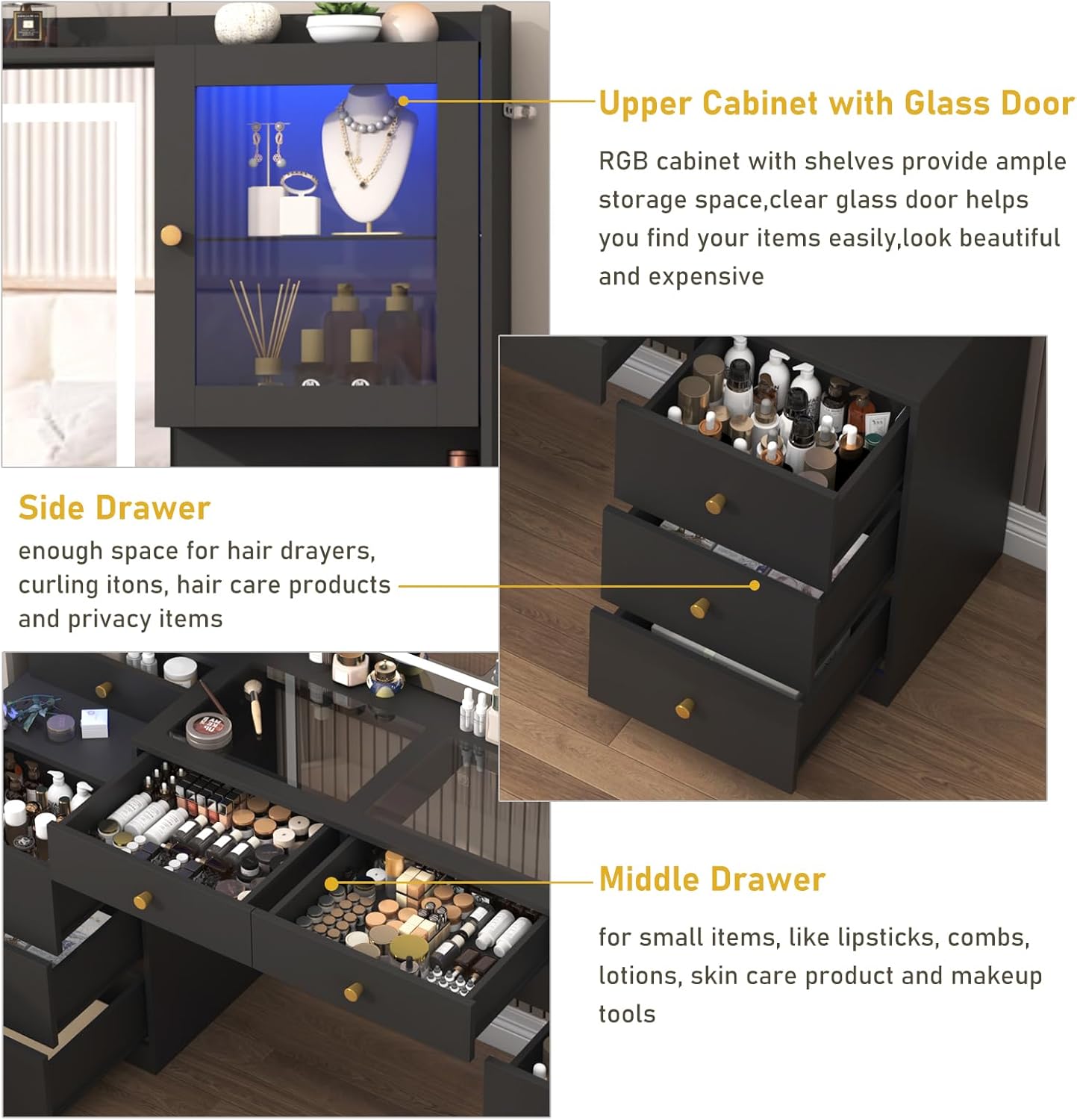 Vanity Desk with 60,000-color LED RGB Cabinets: Our led vanity come with 2 RGB clear tempered glass cabinets which has 60,000 color led lights and multiple lighting modes, like timing function, music sync, mic sync,tec. for choose, you can control it via APP or RF switch. Provide you a stunning visual and immersive experience while you relax or entertain.