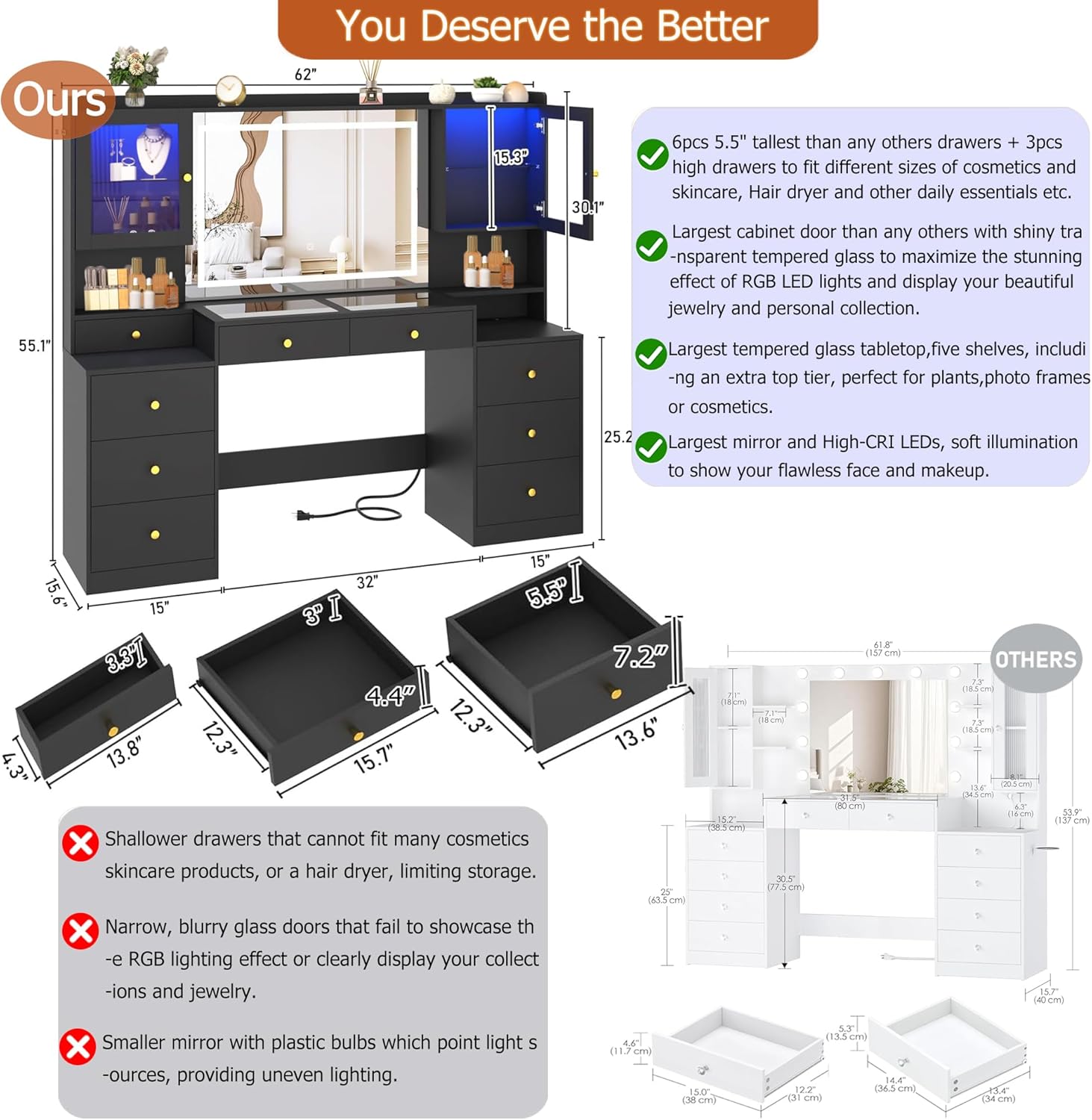 62 inch Large Vanity with Powerful Storage Capacity: 62 inch large table top makeup table with 9 drawers,2 RGB cabinet and different size open shelves also includded top of it provide enough space for your favorite jewelry, hair accessories, hair care products and cosmetics,make your desktop more tidy and clean.The back of the vanity contains an anti tipping device wihch protect your kids and pets.