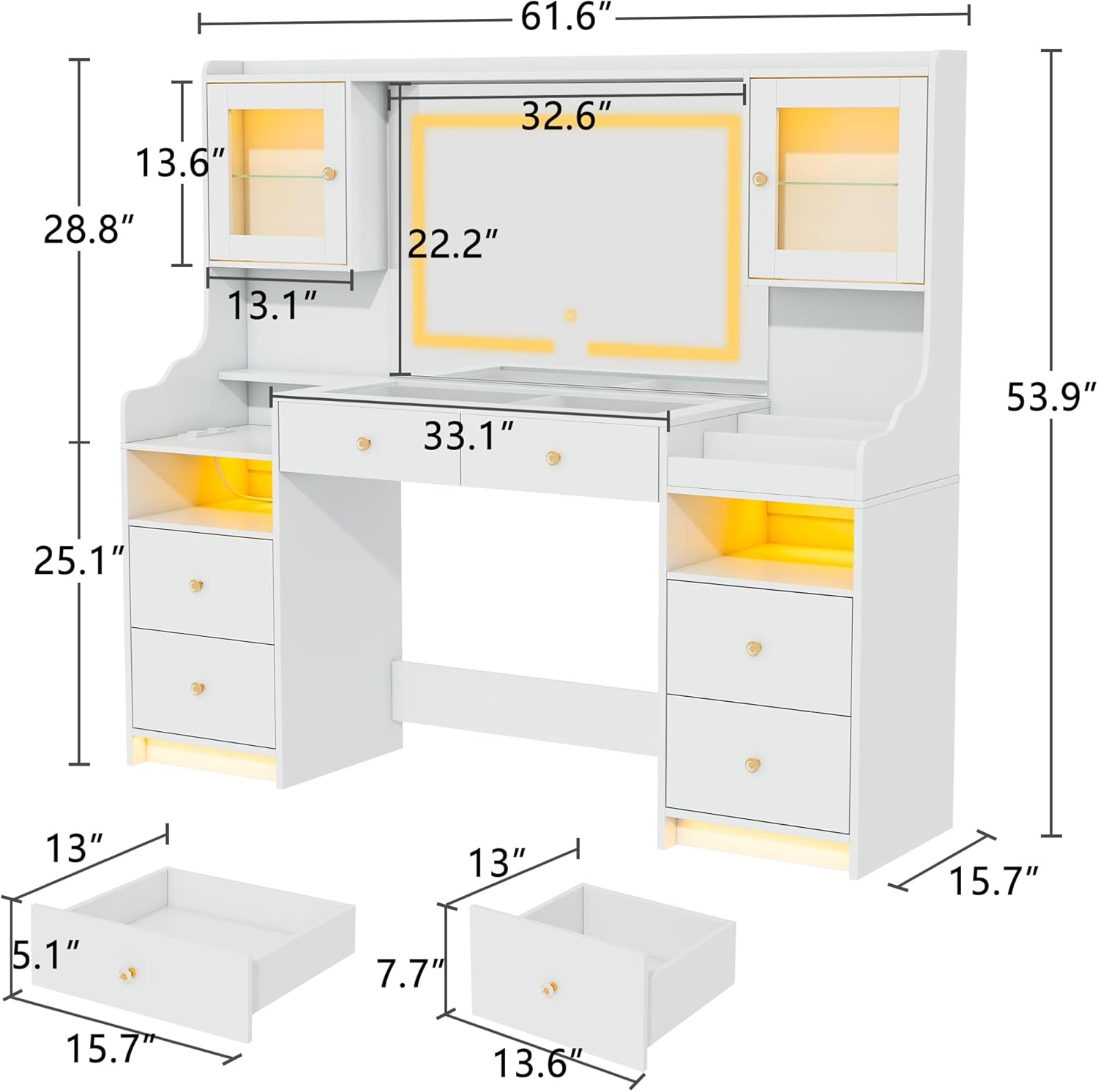 62″ Large White Vanity Desk with Power Outlet, Makeup Vanity with Mirror and LED Lights, One Piece Controls 3 Lighting Modes, 4 Drawers Vanity with 2 Cabinets and Glass Top for Women, Girls
