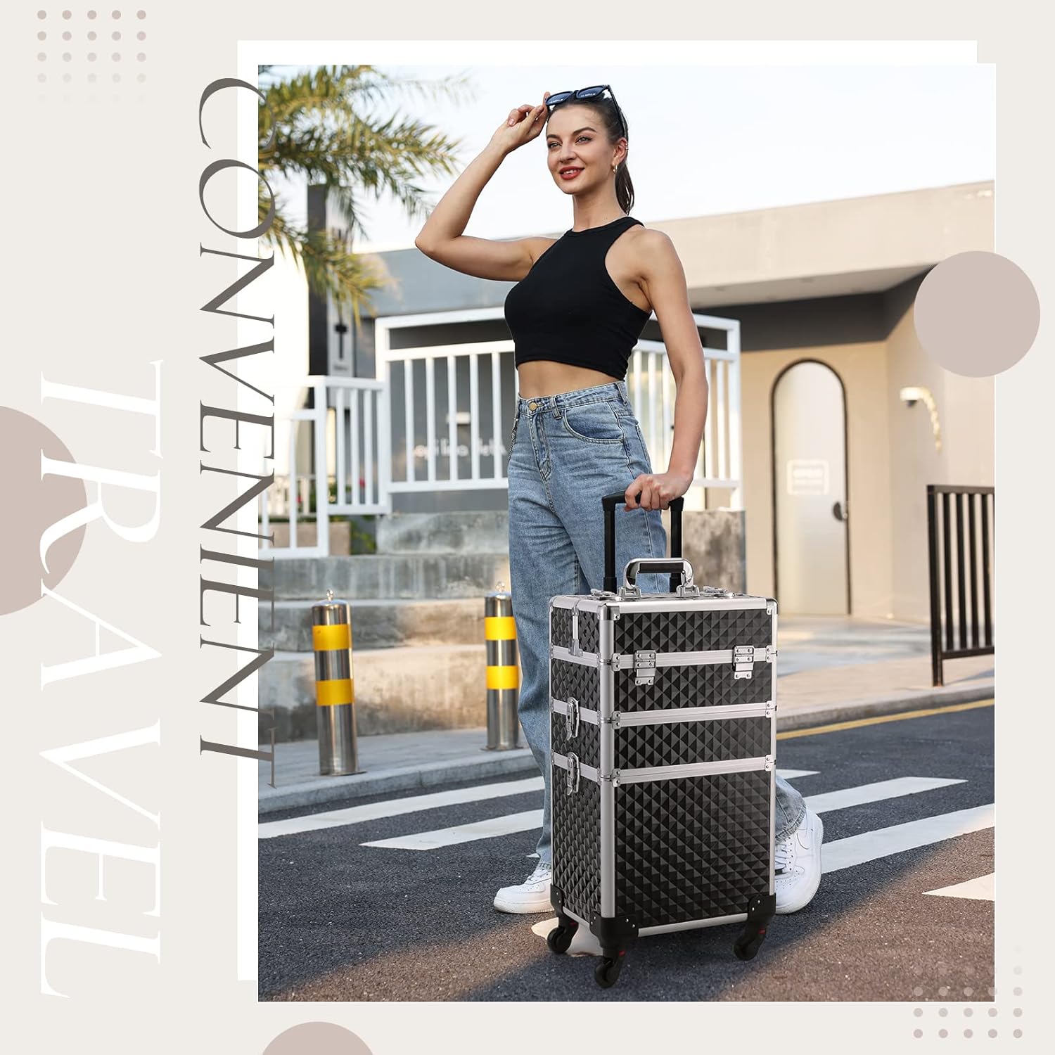 ## Impressive Diamond Style Pattern: This innovative travel rolling makeup train case features the newest diamond pattern in shiny black which shows a cascading effect when viewed from different angles. Combined with the light-weight yet durable structure, it makes full use of storage space for makeup experts.