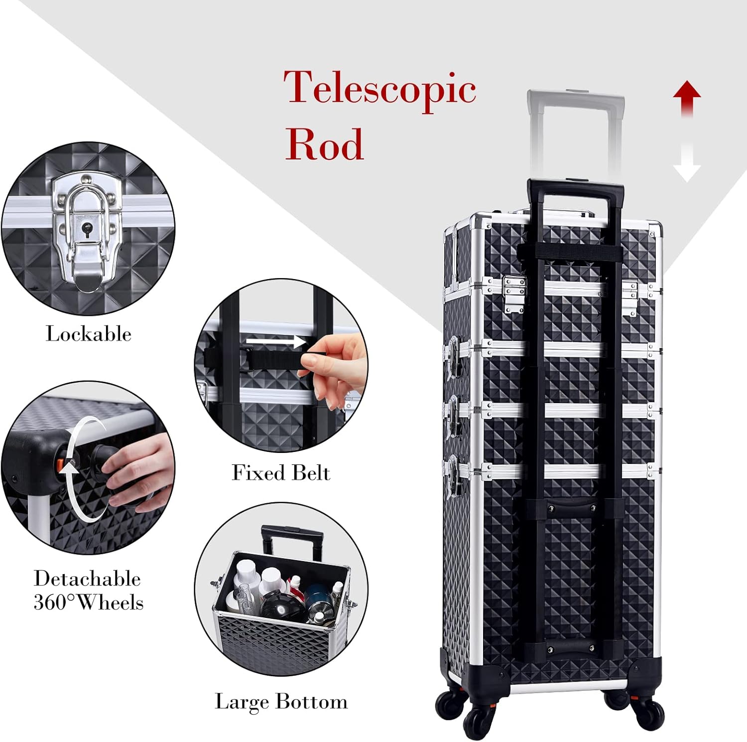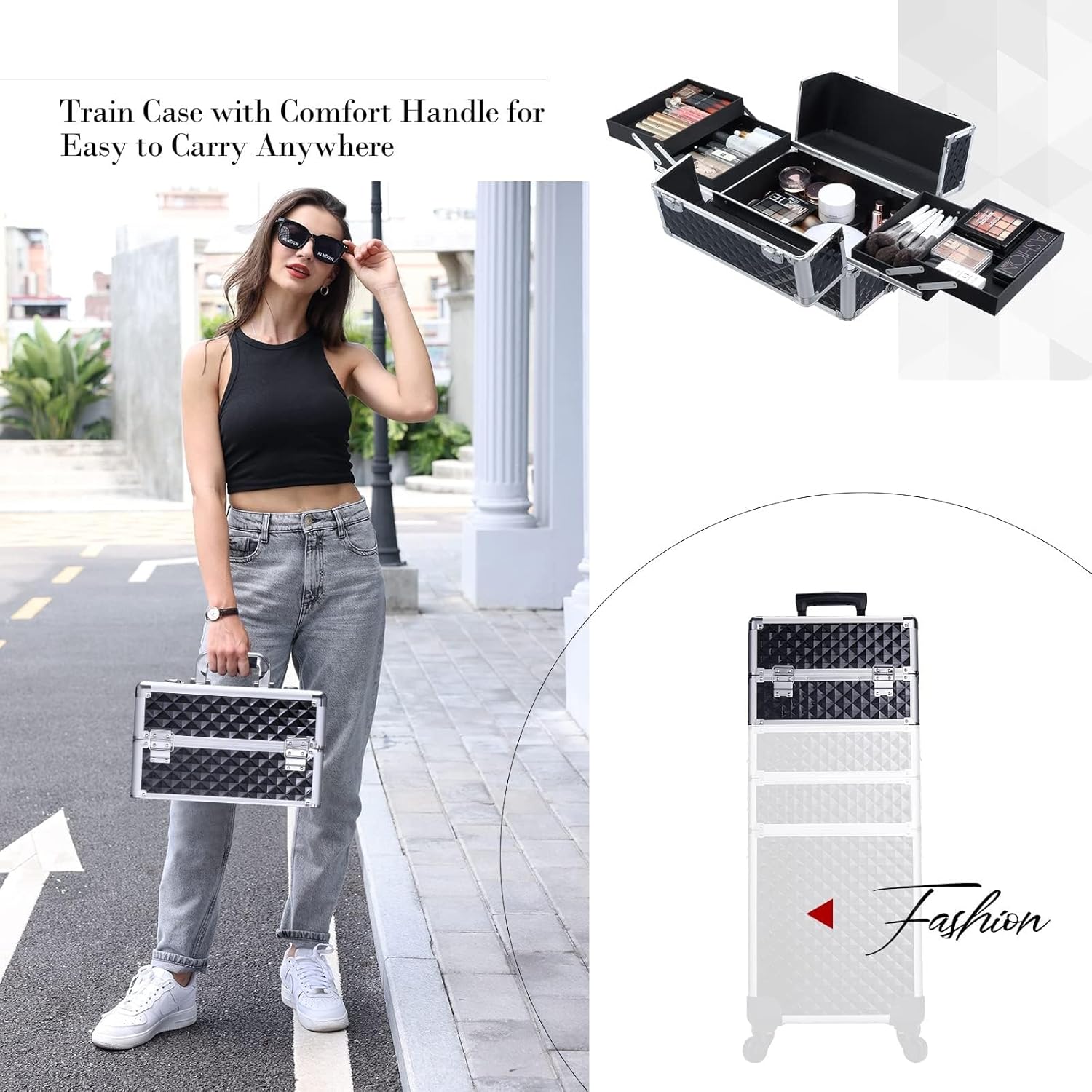 Adazzo 4 in 1 Rolling Makeup Case Cosmetic Train Case Trolley Roll Travel Box for Makeup Artist, Hairstylists, Nail Tech Makeup Cart with Key Swivel Wheels Barber Case Traveling Trunk Black