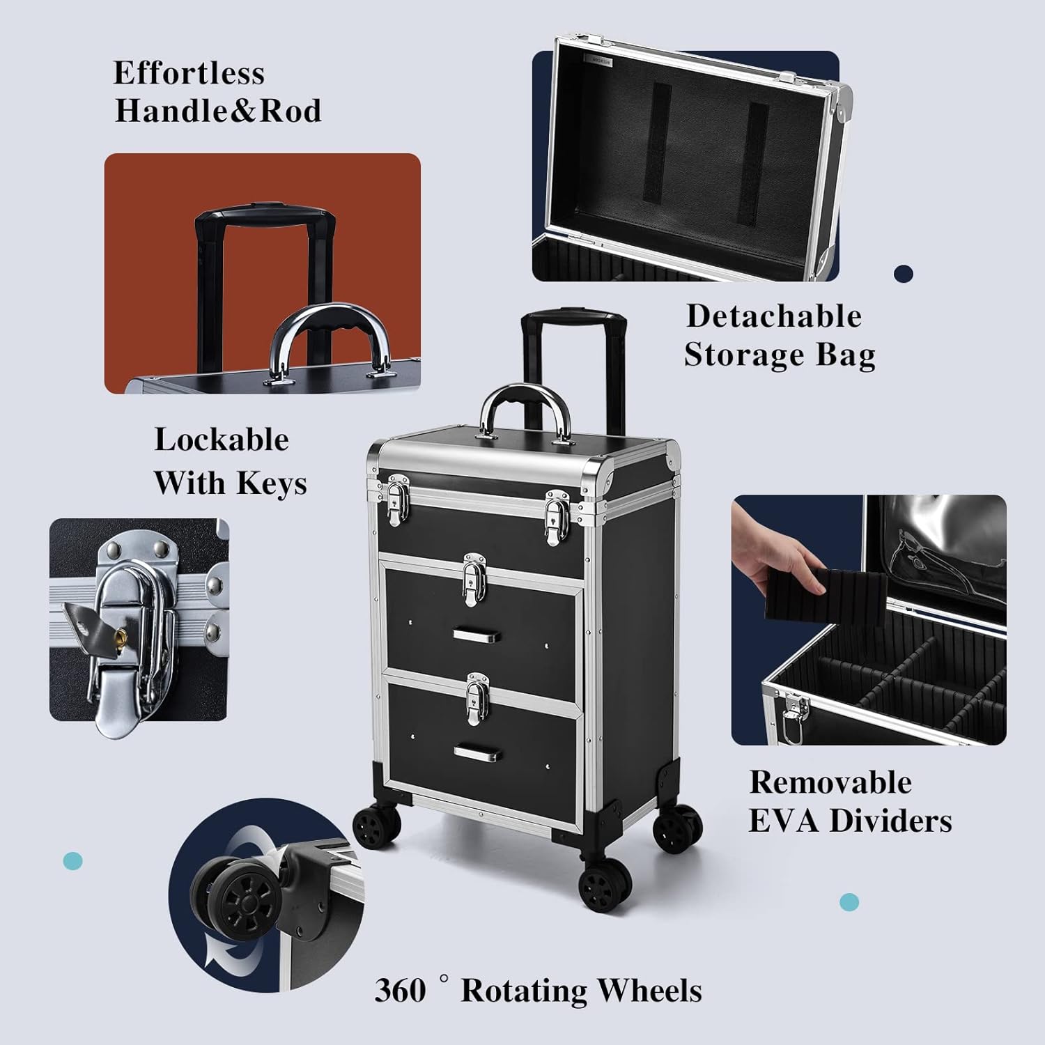 Travel Makeup Rolling Case with Locks: Four 360°rotating wheels are detachable (Detachable wheels can be easily removed or replaced if needed.) and three layers of this makeup case are lockable with key make sure you can move the trolley to anywhere easily and prevent loss of your expensive makeup when you are doing outdoor makeup or having beauty lesson