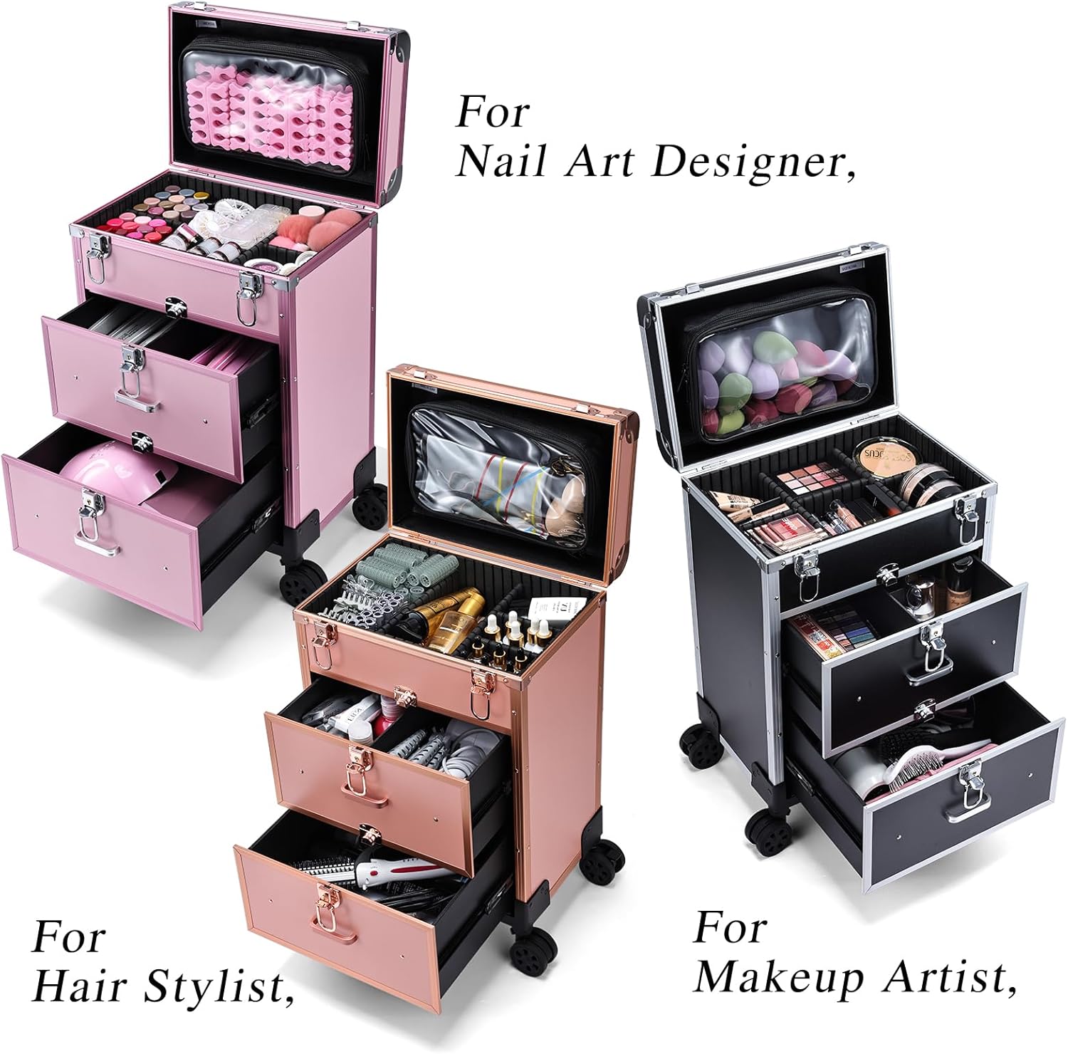 Extra Large Makeup Train Case with Wheels: Size(H*W*L): 22.44*9.48*13.74; The 1st layer is with large PVC makeup bag and divided makeup box, small pieces such as makeup brush, lipstick, nail gel, nail polish, and so on can be organized neatly here. The second layer with two medium compartments is suitable for full-sized cosmetics (palettes, makeup foundations), the bottom layer is designed for tools for makeup / nail art / hairdressing, such as spray, nail lamp, nail file, hair dryer, hair curler