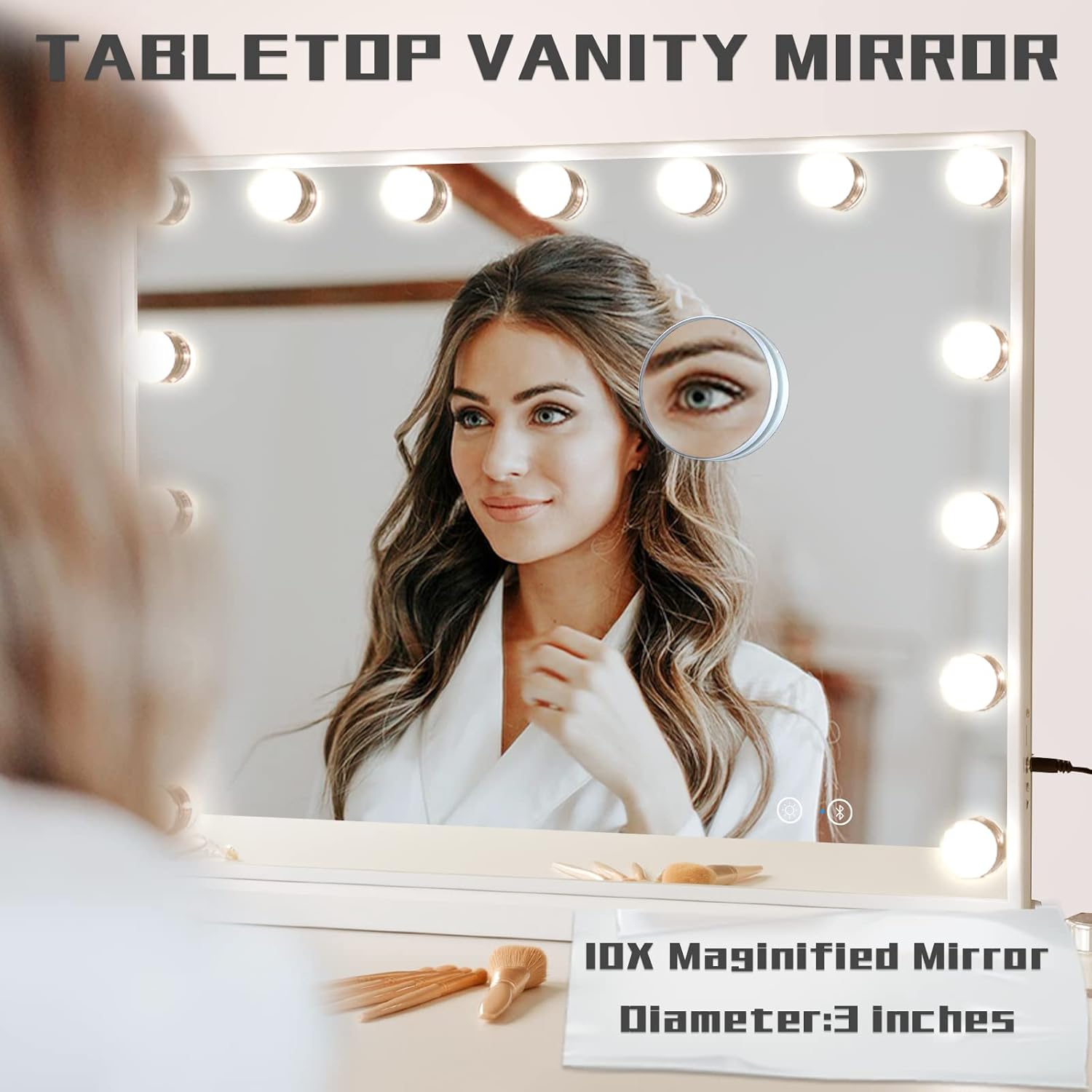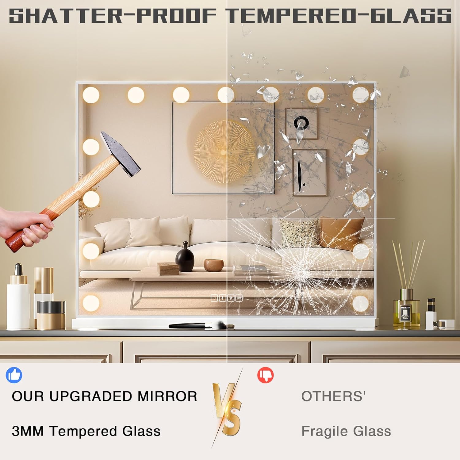 【3 Colors Lighting Modes & Adjustable Brightness】Large vanity mirror with lights is surrounded by 15pc LED dimmable bulbs. 3-tone setting ranges from warm light, daylight to cold light, step-less dim or brighten brightness, easy to know how you look in each light or applying certain products that require different lighting, like foundation