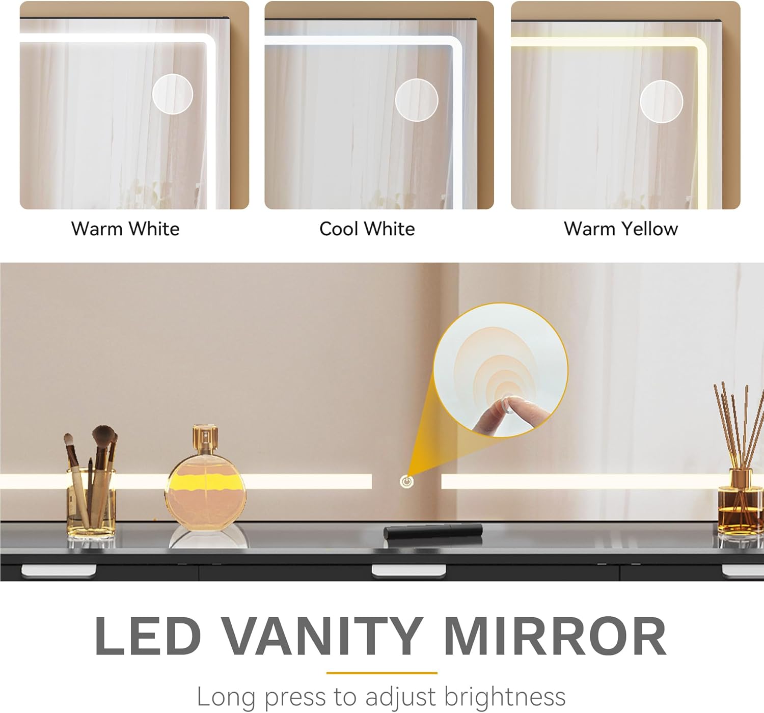 DWVO Makeup Vanity Desk for Dressing Room, Vanity Mirror with Lights & Charging Station, Dressing Table, Vanity Stool