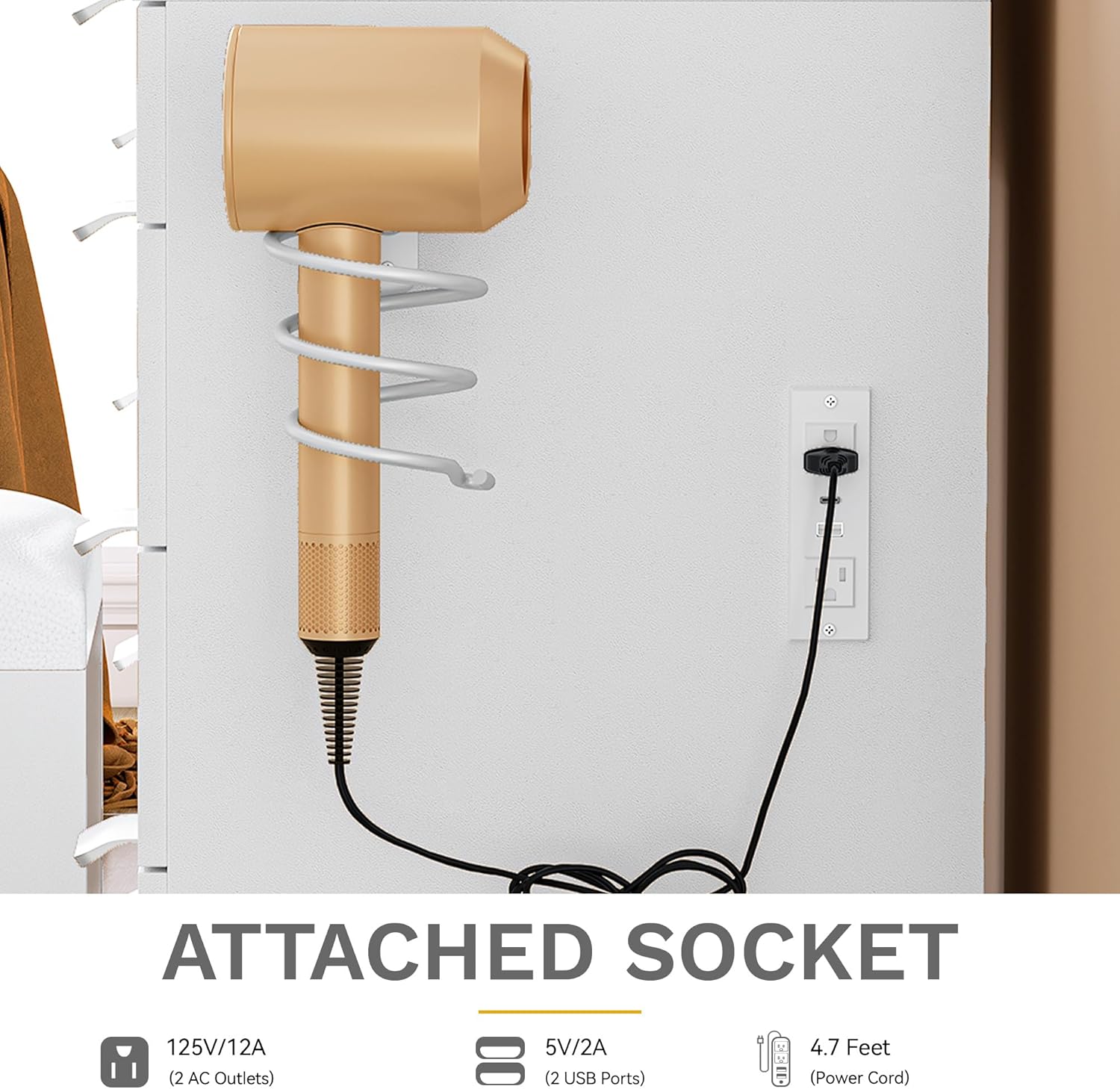 With a power strip and hair dryer rack