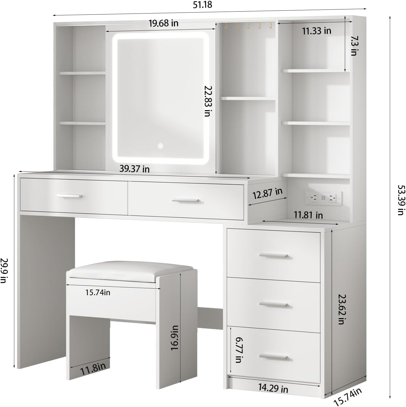 Lots of Storage Space & Large Desktop:This vanity with mirror and lights comes with hidden storage shelves, open storage shelves, 5 large drawers and large table top,that can easily hold all your cosmetics, jewelry, hair dryer, curling iron and other beauty essentials.In addition,the shelf on the top of the makeup table can also place some light books or decorations. Let you have a neat desktop from now on.