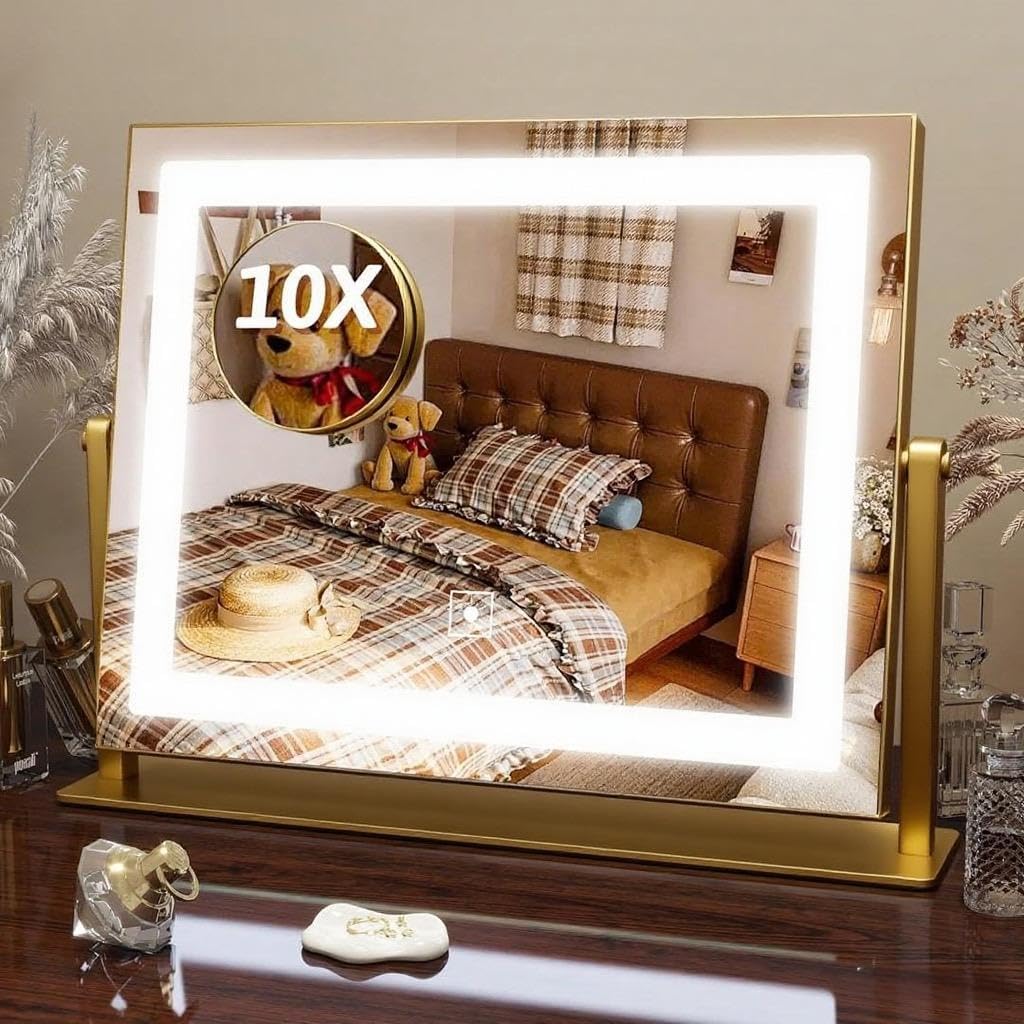 FENNIO Vanity Mirror with Lights, 12″ x 16″ Lighted Makeup Mirror with Smart Touch Control, 3 Color Modes & Brightness Adjustable, LED Makeup Mirror with 10X Magnification, Square Gold
