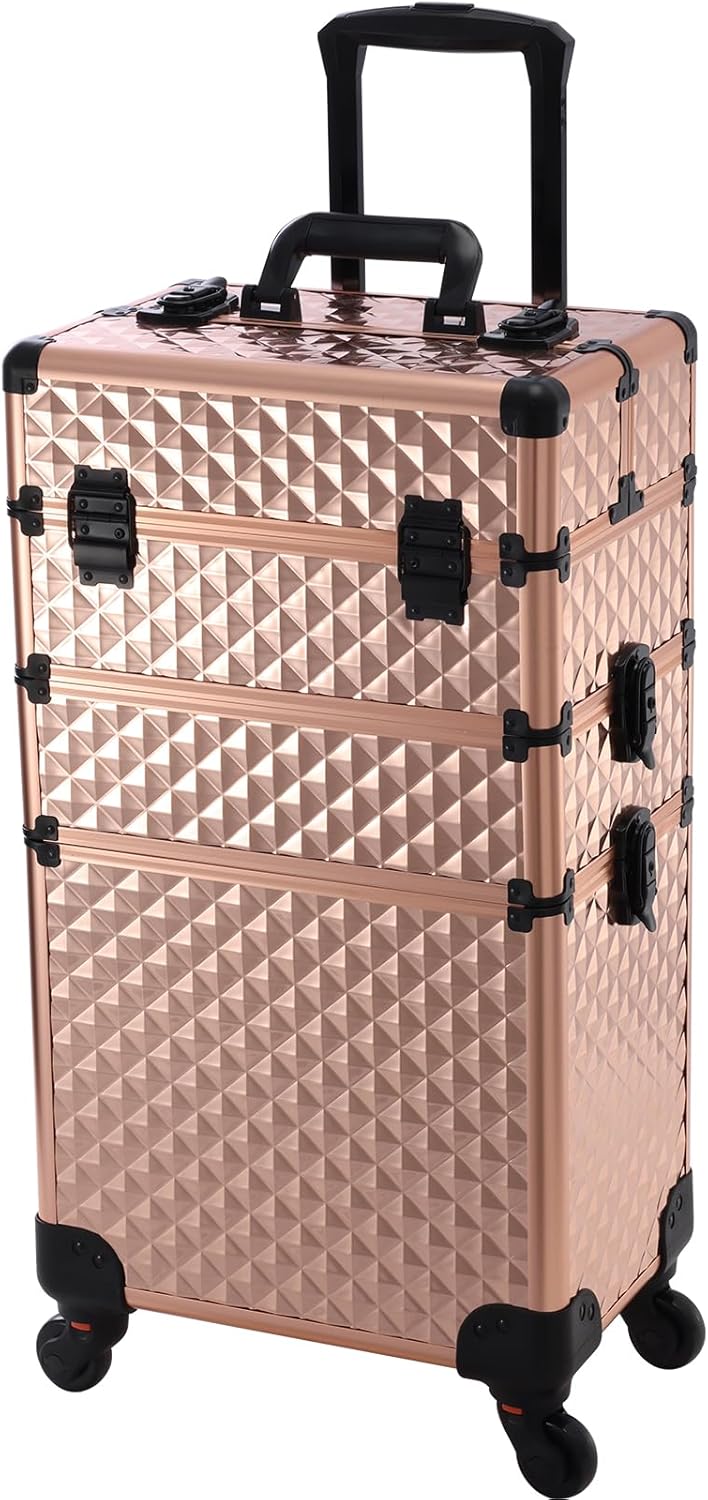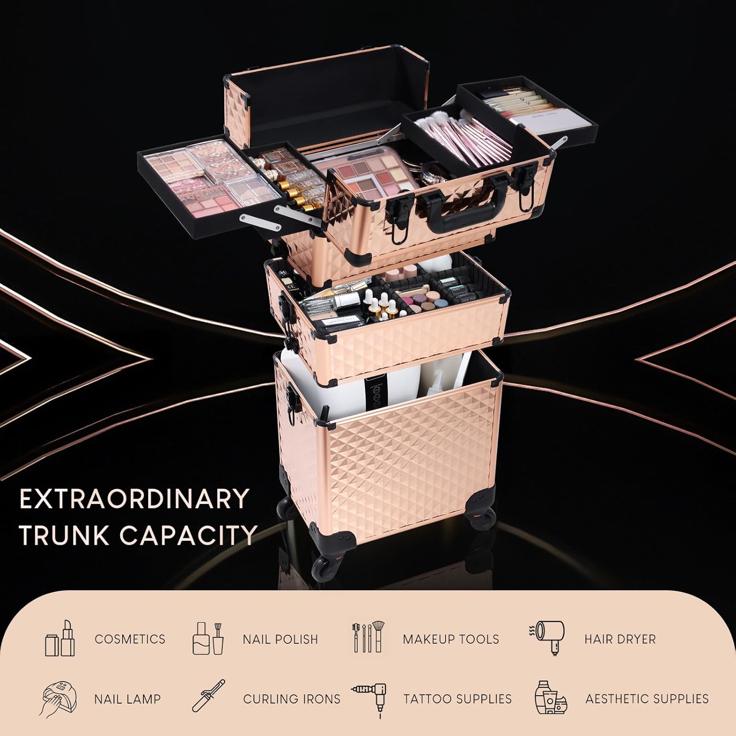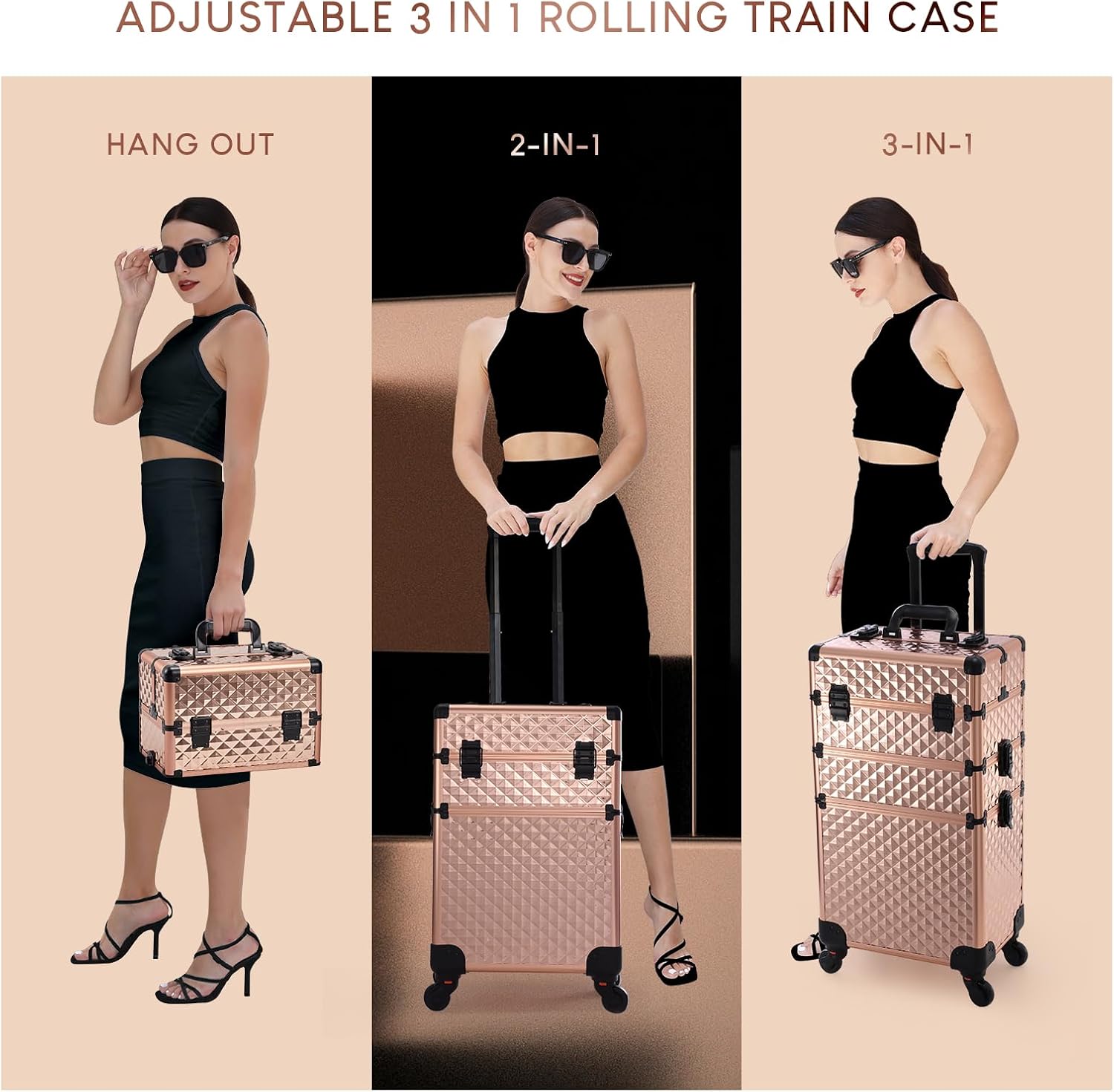 Frenessa Rolling Makeup Train Case 3 in 1 Professional Cosmetic Trolley Large Storage with keys Swivel Wheels Salon Barber Case Traveling Cart Trunk for Make Up Nail Tech – Vintage Rose Gold
