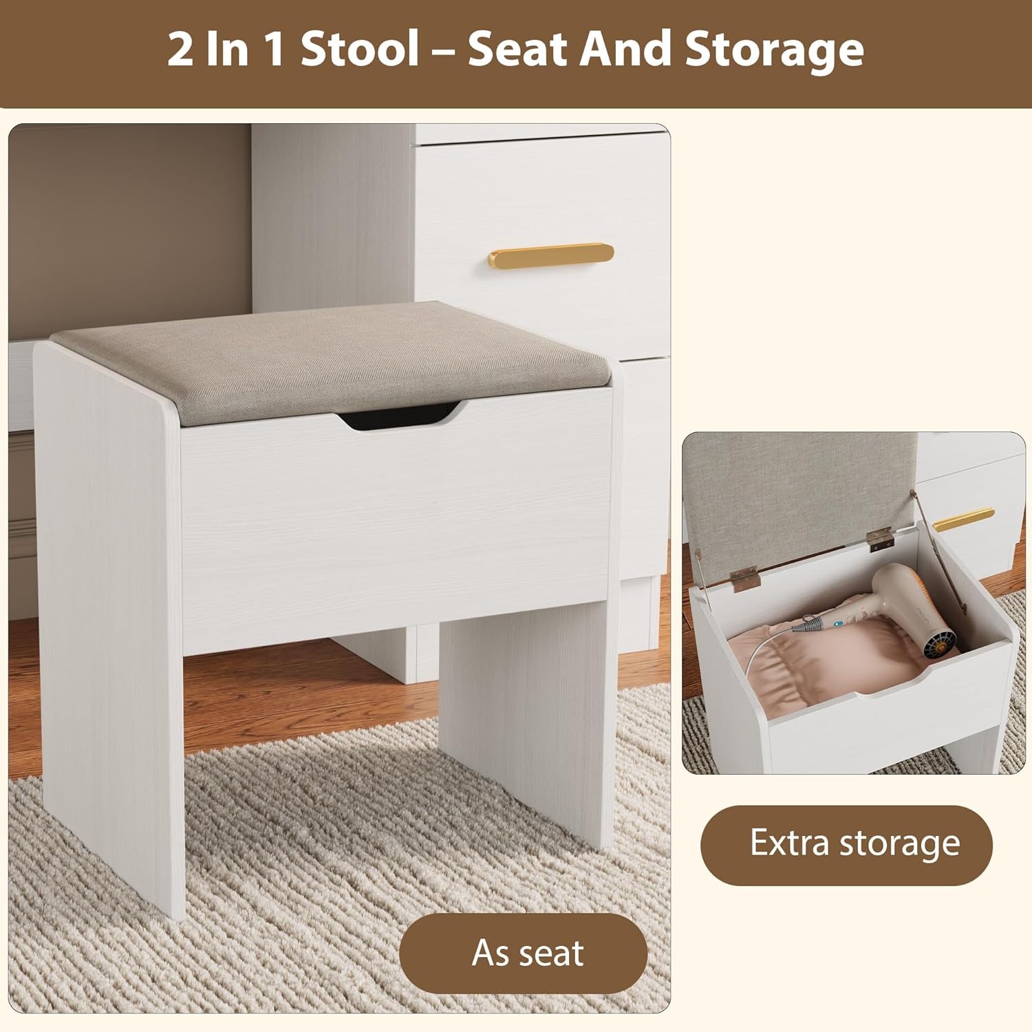 This seat is set at the ideal height for the vanity, offering plush comfort and firm support, so you can admire your lovely reflection with ease;Additionally, the seat cushion opens up to reveal a storage compartment, perfect for keeping your daily essentials.