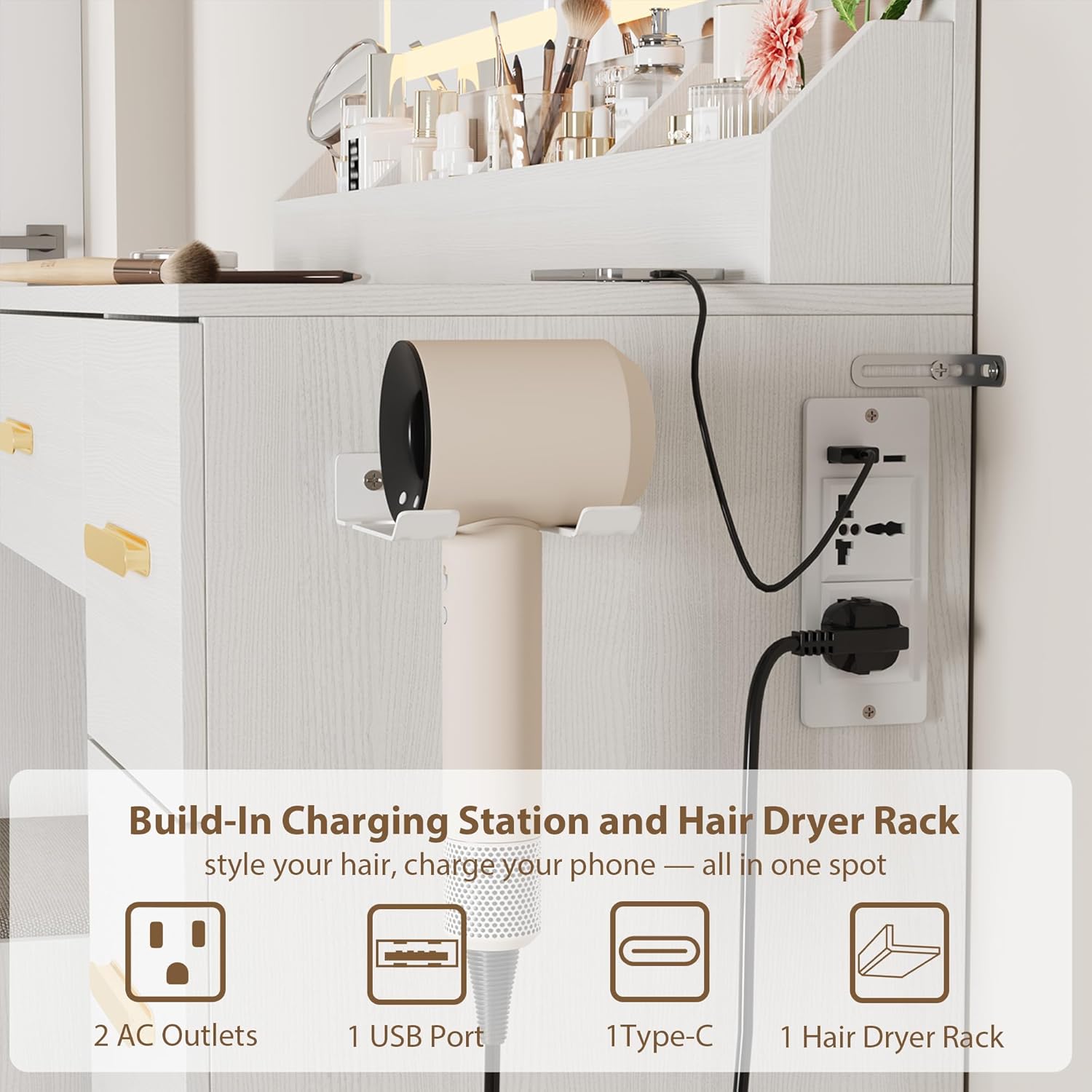 【Built-in Power Outlet】This vanity table comes with an integrated charging station, featuring 2 USB ports and 2 standard outlets. It offers convenient charging for phones, headsets, iPads, laptops, fans, hair tools like curling irons, straighteners, blow dryers, and other beauty devices. Transform your makeup table into a practical multi-functional space where you can both get ready and charge your devices without any hassle.