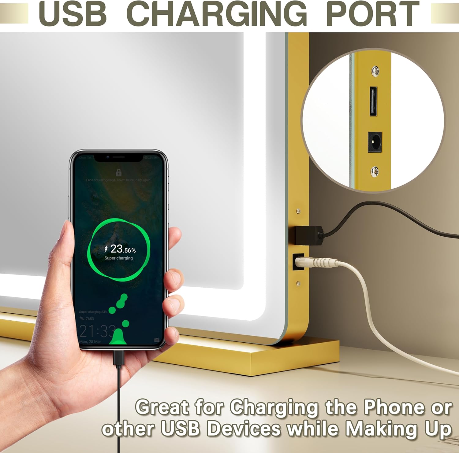 【USB CHARGE PORT】 The right side of the vanity mirror is equipped with USB charging ports, which can charge your smartphone, computer or other USB devices, giving you a different and convenient experience.
