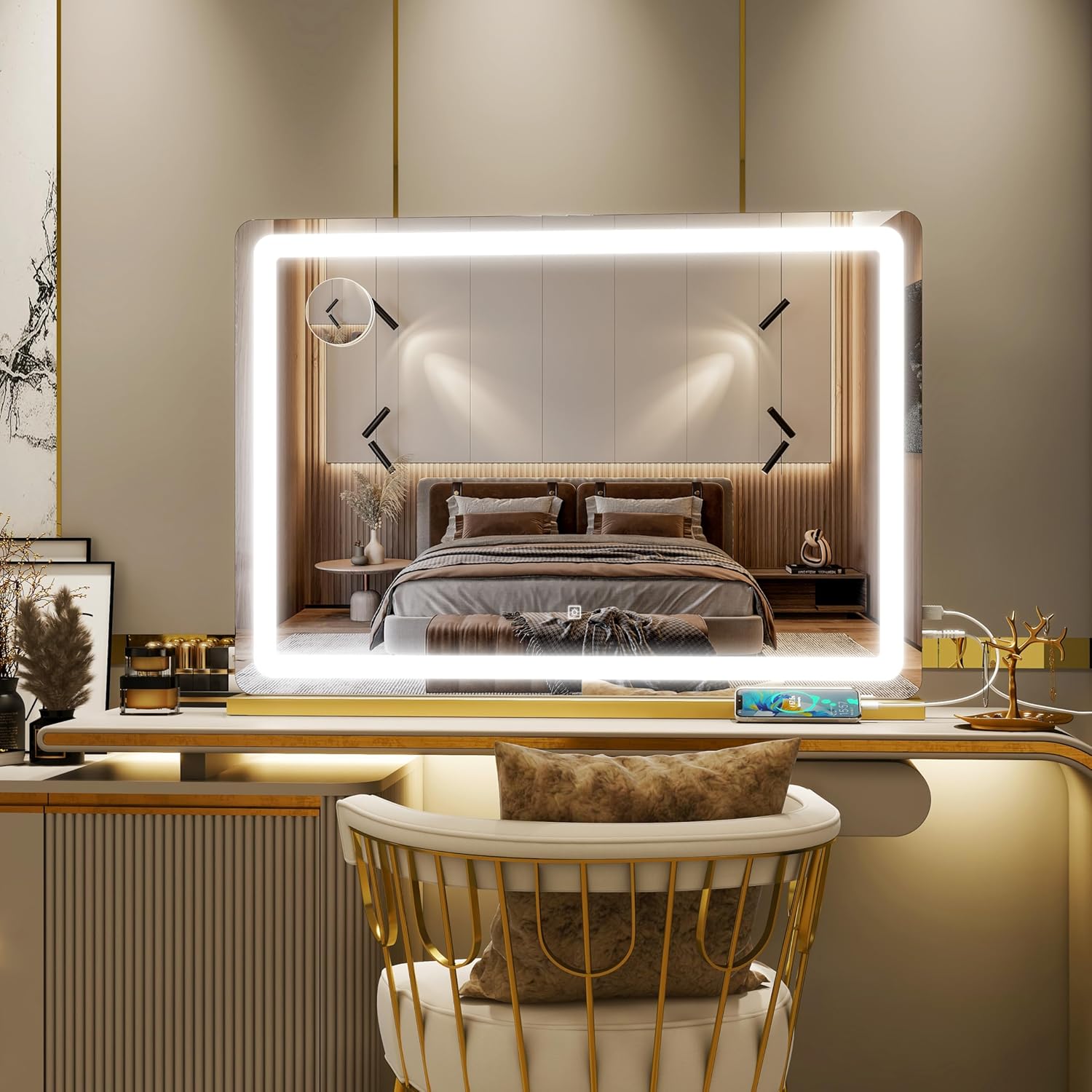 Gold Vanity Mirror with Lights, 32″ x 22″ Large Lighted Vanity Mirror with Dimmable 3 Modes, LED Makeup Mirror, USB Charging Port, Tabletop or Wall-Mounted