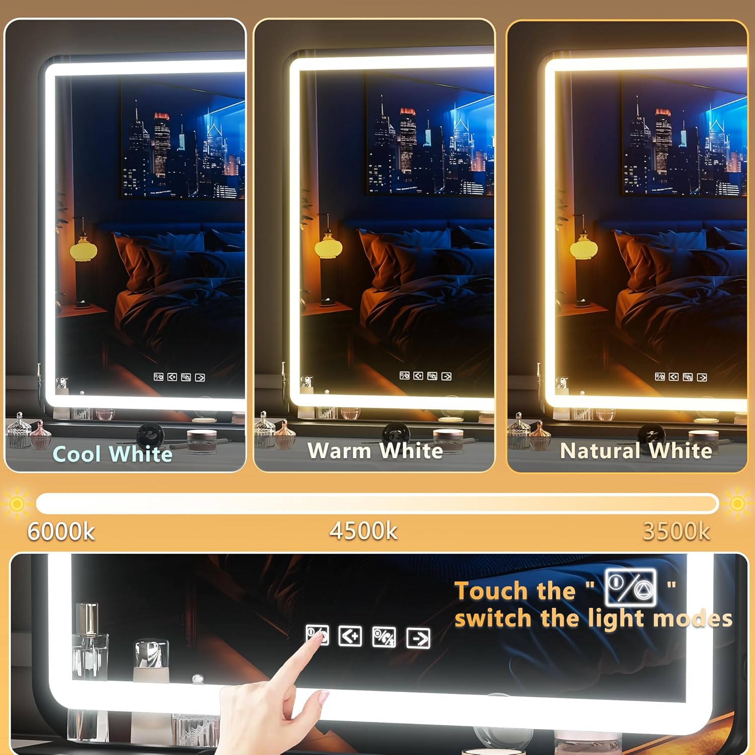 👍【Smart Touch Control & Memory Function】This makeup mirror with lights has 3 smart touch buttons, turn on/off the light by touching the sensor switch, Press left button to change the color modes, long press right button to adjust the led brightness. This lighted makeup mirror is specially designed memory functionfunction keep your lights setting like your last use.