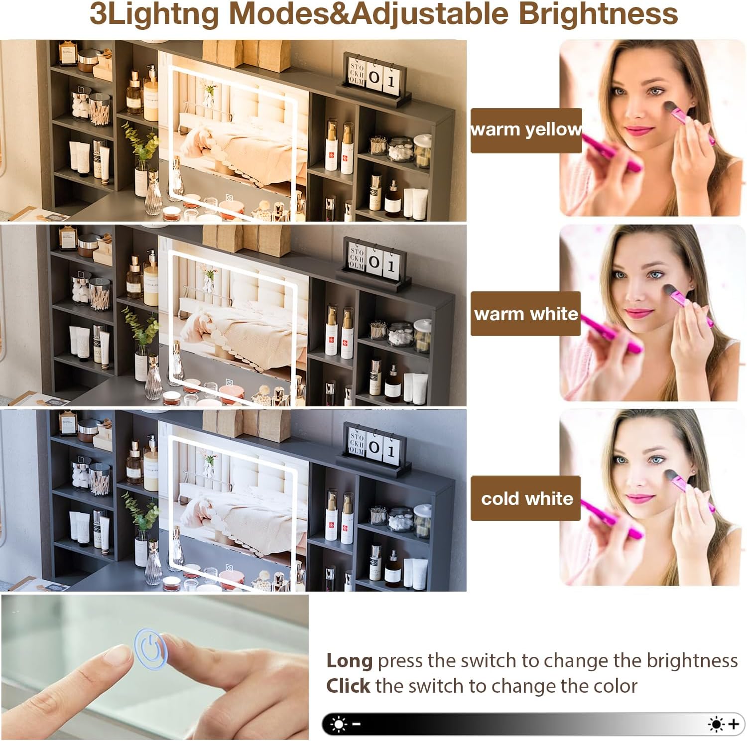 【Vanity Mirror with 3 Color Light Modes】- The LED strip offers 3 color modes for customizable lighting,short press the switch to switch the light color: warm yellow, warm white, and cool white. adjust the brightness according to different scenes and makeup needs by long pressing the switch. add a sense of glamor and style.