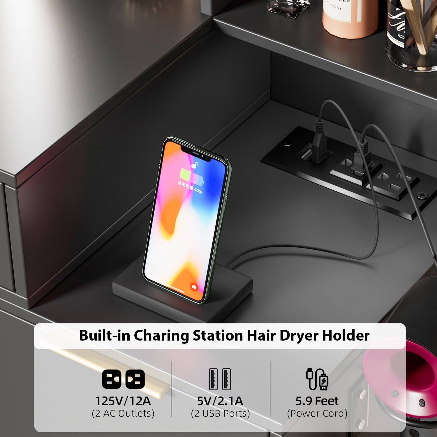 【Vanity Table with Charging Station】- This make up vanity adds an upgraded design with 2 standard plug sockets, 2 USB ports and hair dryer holder, allowing you to sit at your vanity and use your hair dryer or curling iron with the power strip within easy reach. It also provides great convenience for charging mobile phones, tablets, headphones or other mobile devices.