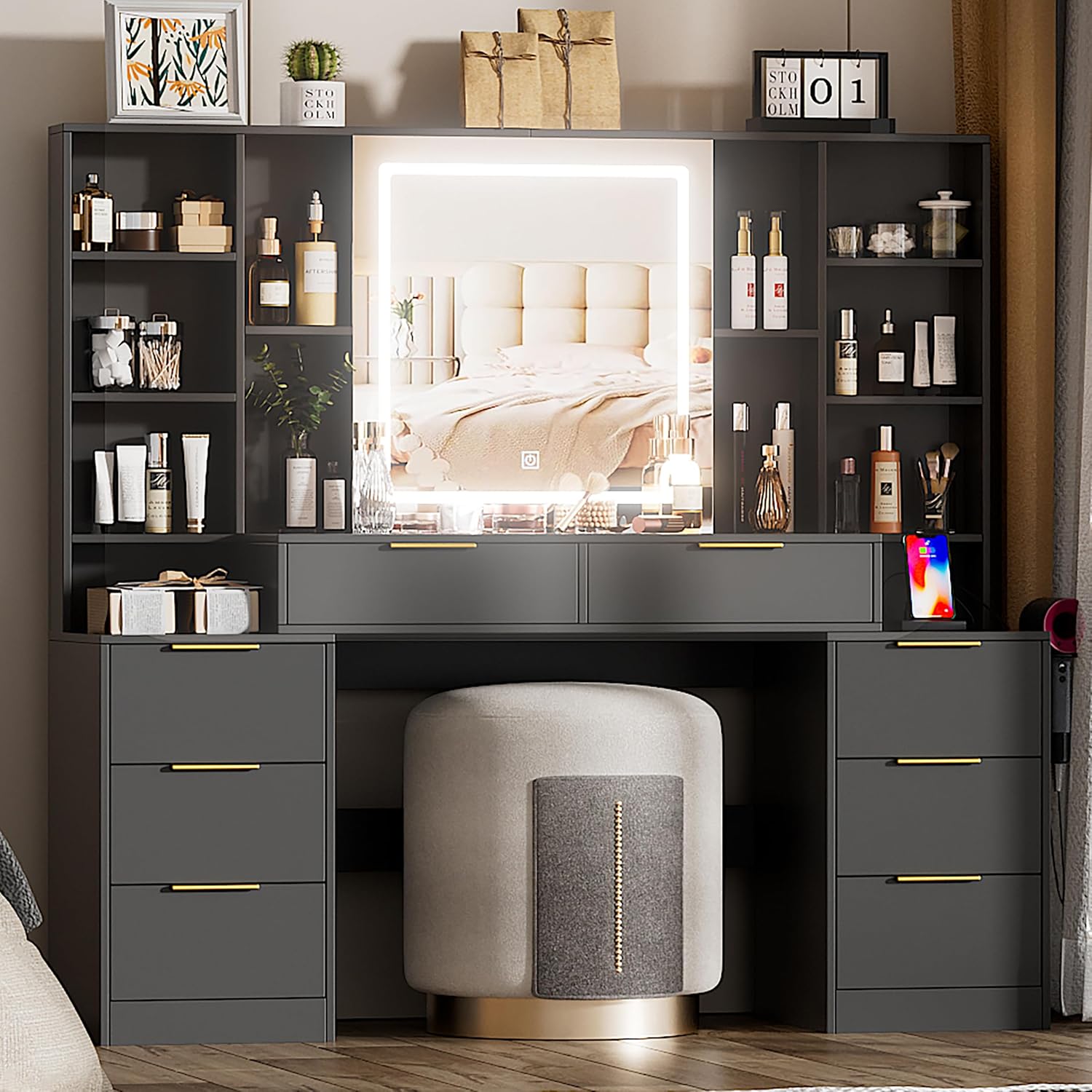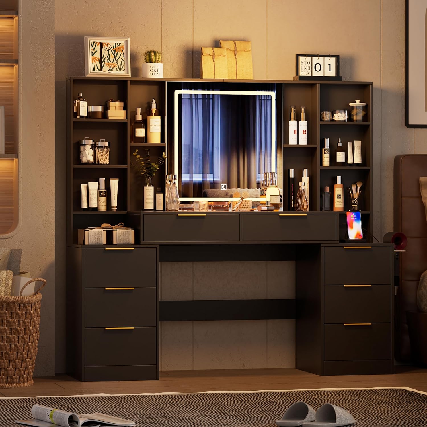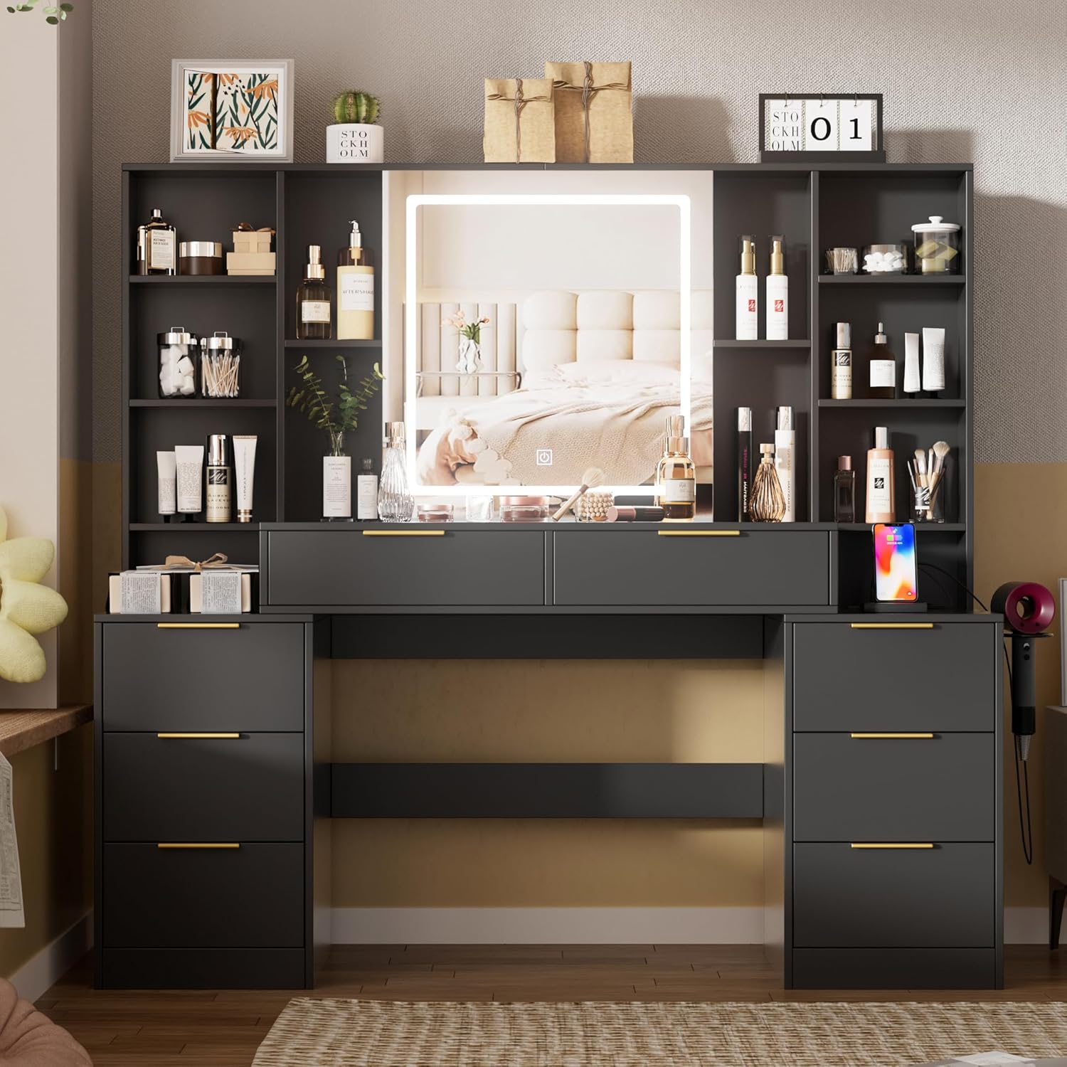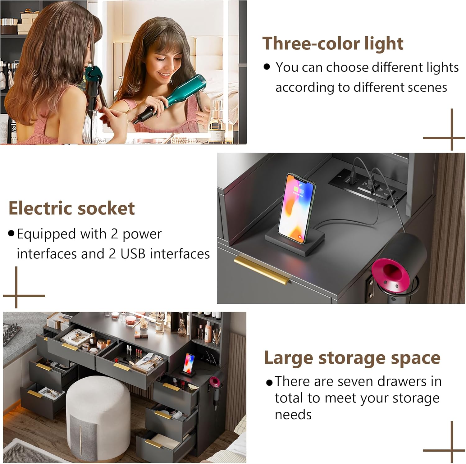 Large Makeup Vanity Desk with Lighted Mirror & Power Outlet,Dresser Table with 3 Lighting Modes Brightness Adjustable,Drawers,Shelves,Hair Dryer Stand for Bedroom,Black (No Stool)