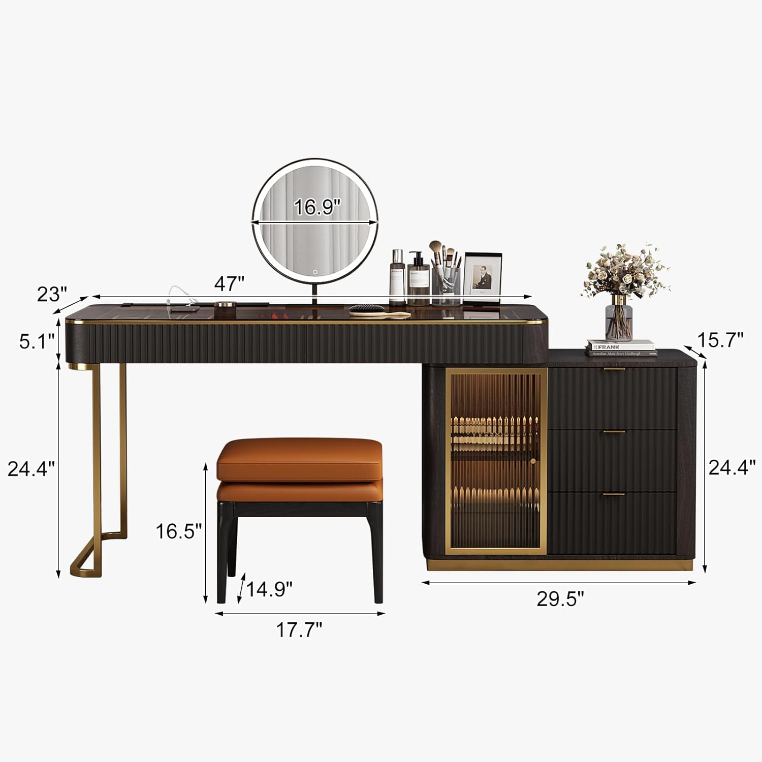 Larits Makeup Vanity, Very Easy to Assemble,Dressing Table Desk in one, Super Storage, with LED Light Vanity Mirror with ash Full Solid Wood upholstered Vanity Stool (Black Brown, 47 in)