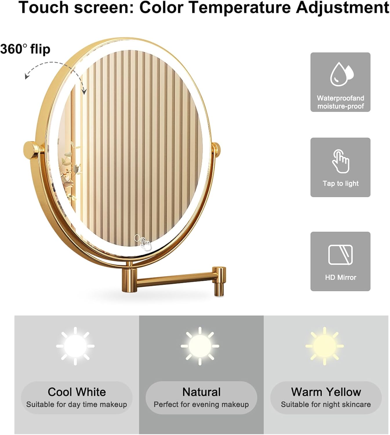 360 ° rotating multi-angle, close to “complement” your beauty, with three bright light, soft light strong light touch switch, so you can have a show level exclusive dressing room without leaving home. The mirror flips when not in use.