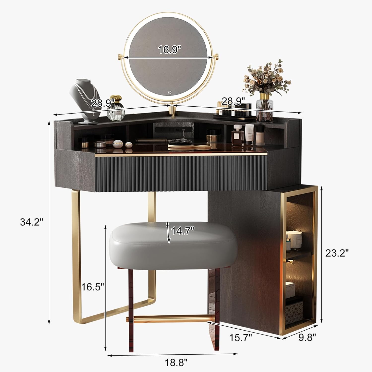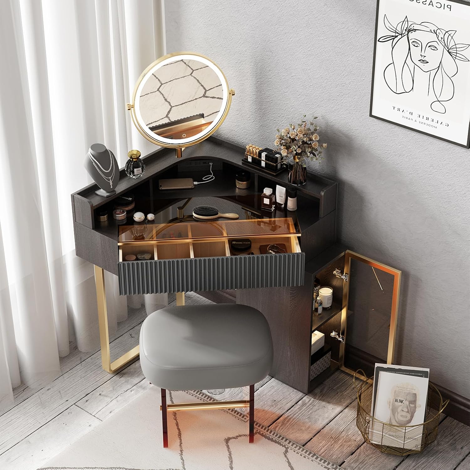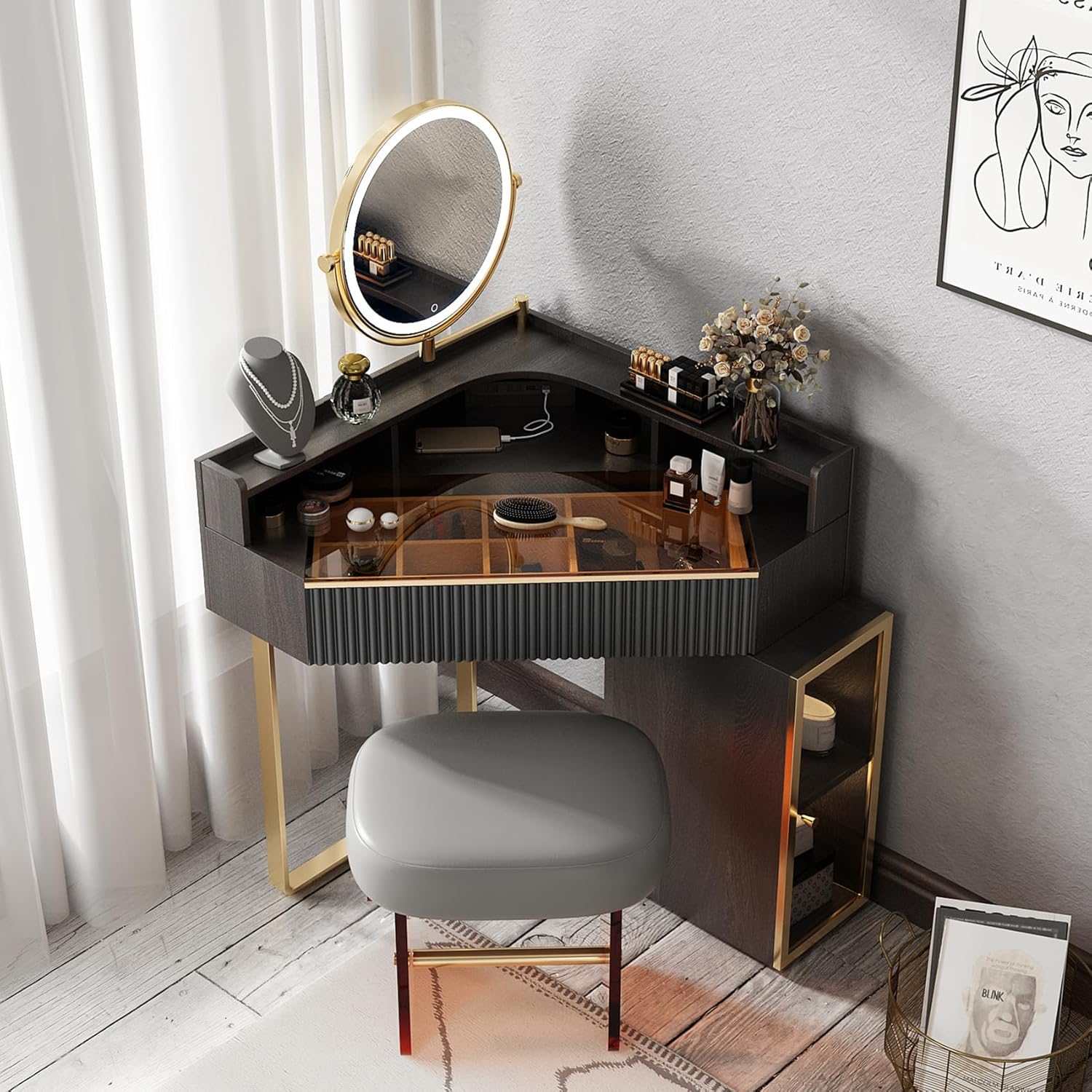 Lartis Corner Vanity Desk with Stool Bedroom Corner Vanity Set, 1 Storage Drawer, 1 high Storage Pull Cabinet, 360 °Rotatable Dimmable Makeup Mirror(Black)