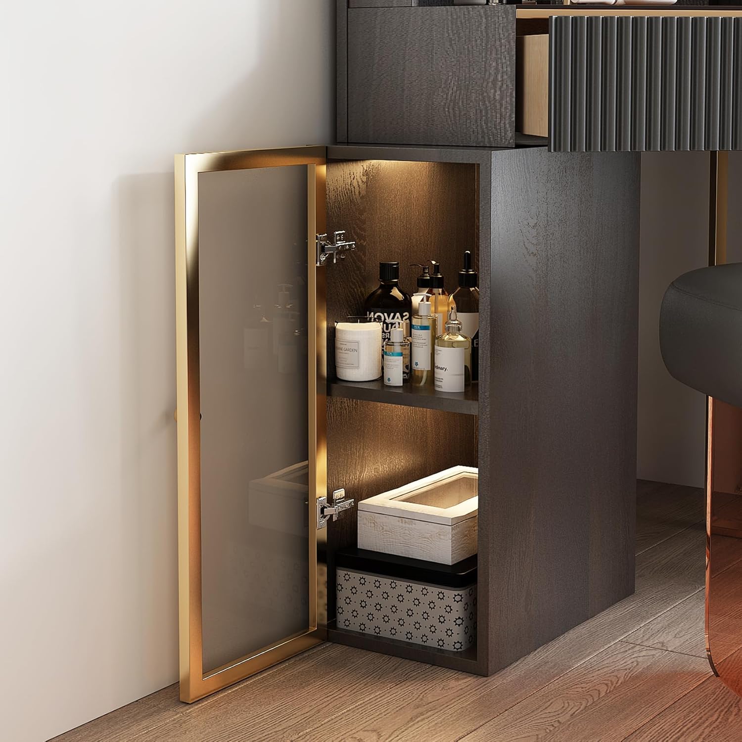 If you are a pursuit of fashion but because of the small size of the household and can not buy the desired dressing table, then take a look at this right-angle design, more space-saving dressing table makeup stool set it!Tempered glass in teal color allows the cabinet storage at a glance, skin texture finish with stainless steel gold-plated enamel process stand makes the appearance more simple, and a touch of light luxury and elegance.High storage storage pull cabinet, built-in rechargeable sensor light, open to light, the rainbow glass as a detail into the dressing table, become the finishing touch to the space, to bring you a kind of hazy beauty.The main material is made of MDF (high-density medium fiber board) with EU standard E1 grade, the paint color is firm, waterproof and impermeable, and the matte texture of the finish is like touching skin texture. Its glossiness is higher than other boards on the market, and its odorless shows low-key luxury.