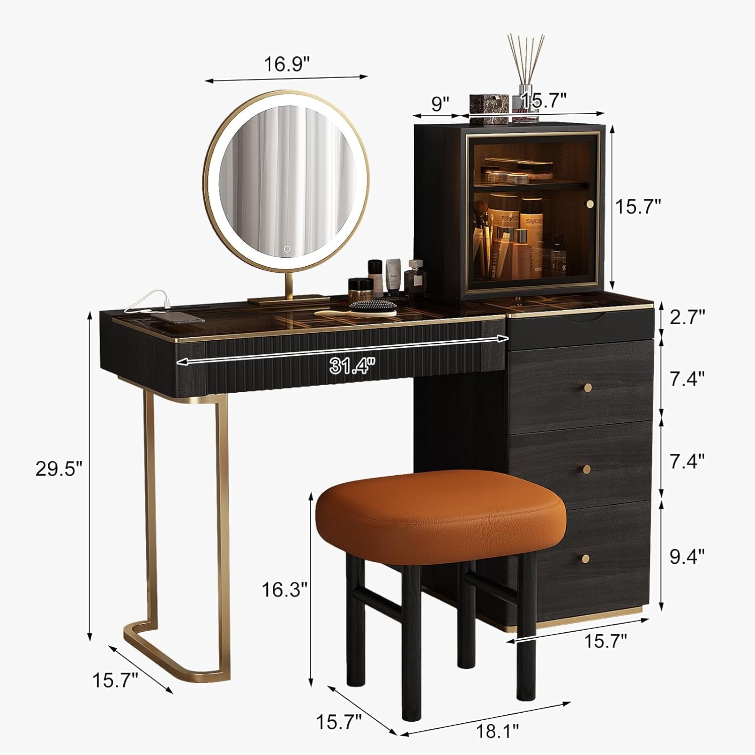 【Fully functional】. Dressing table is equipped with two power jacks and two USB jacks. Cell phones, hair dryers, and curling irons can be used at will. Equipped with LED light-emitting makeup mirror and solid ash wood upholstered makeup stool, dresser matching purchase, make home more cozy.
