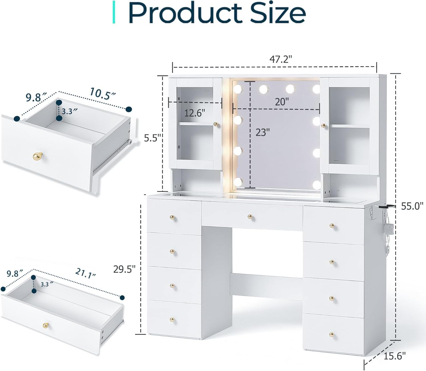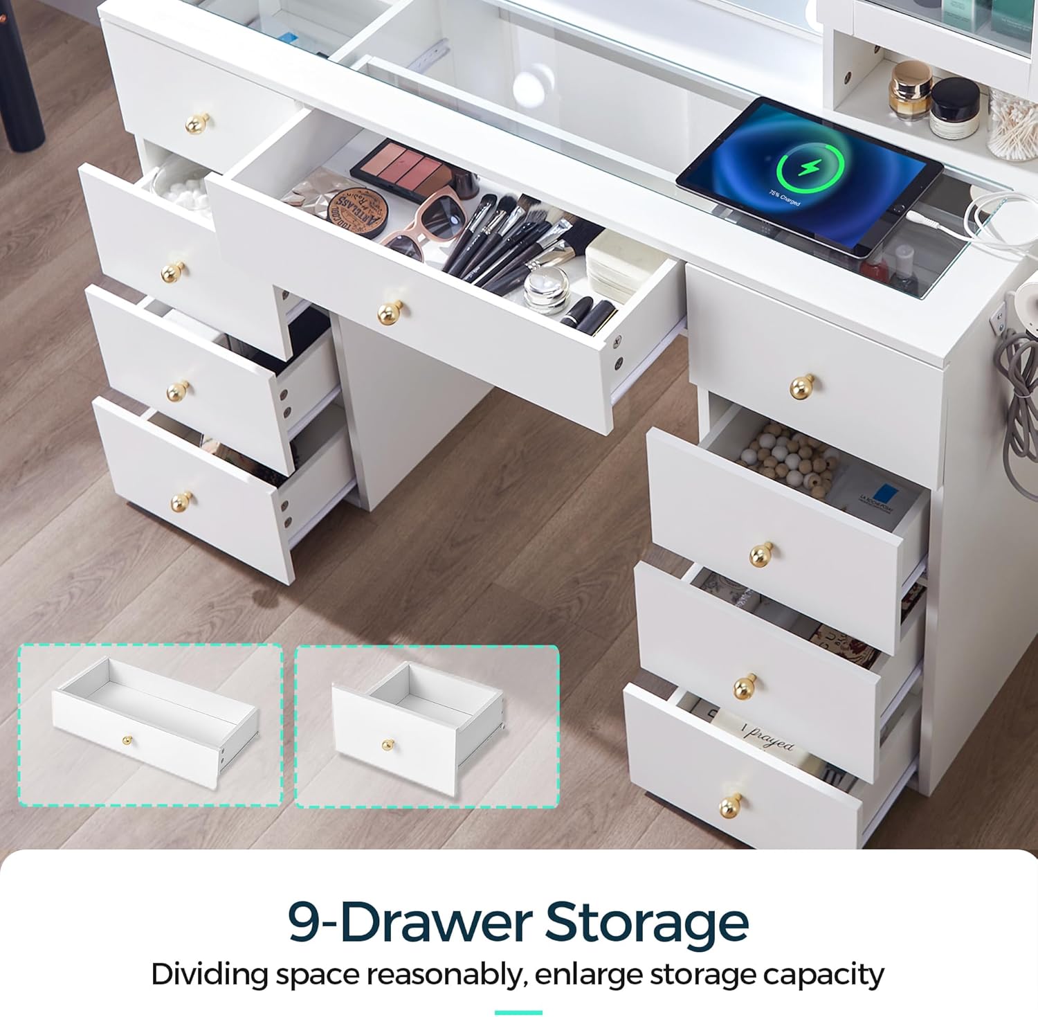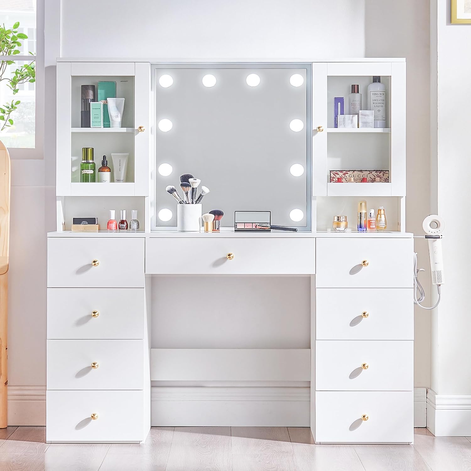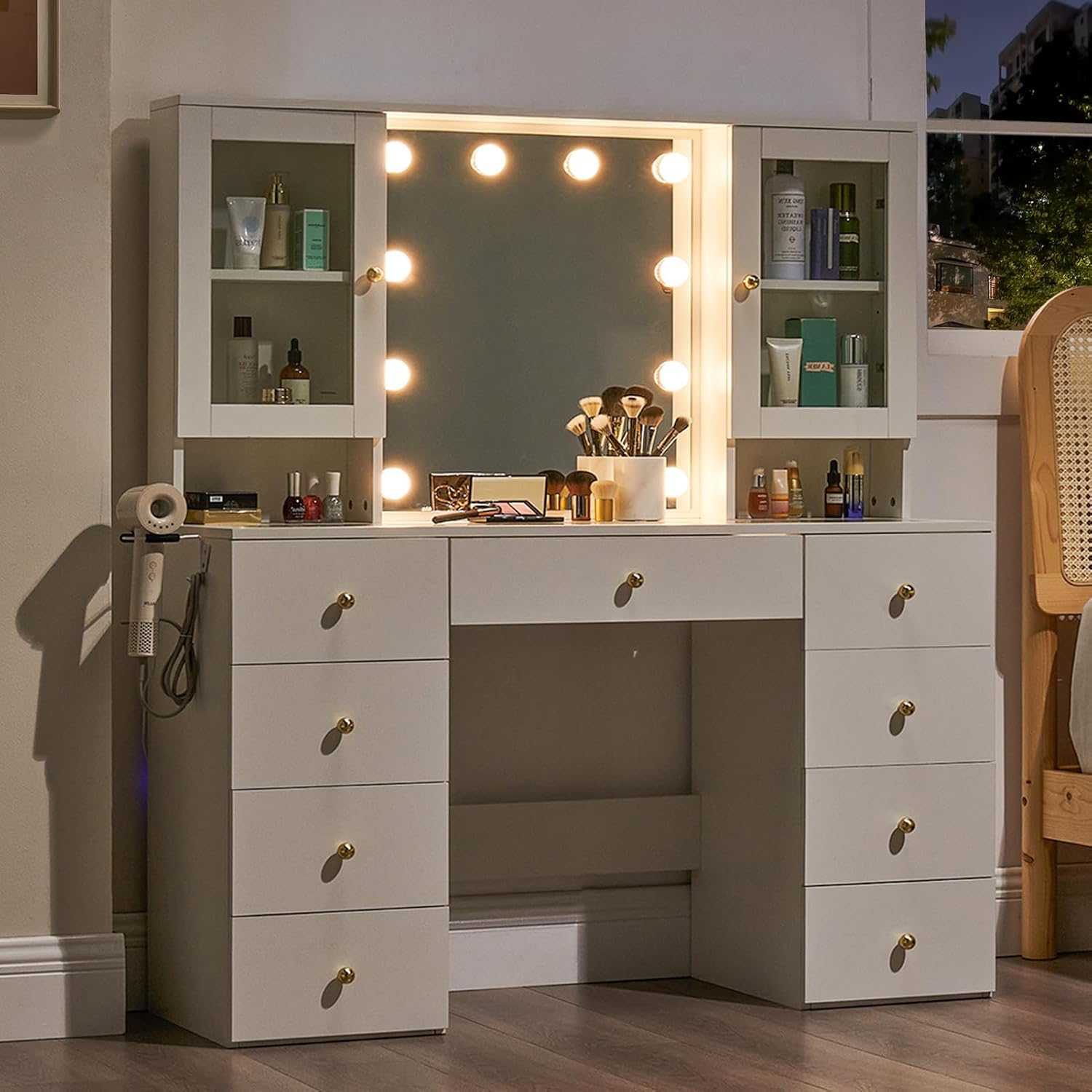 * AMPLE STORAGE: Offering a robust storage solution, this vanity with lights includes 9 drawers and 2 glass cabinets. 2 storage shelves with glass doors to prevent items from dust and falling, the adjustable shelf accommodates items of various heights. 9 Large drawers can be classified to store cosmetics, skin care products, jewelry, etc., which can easily accommodate all your belongings. Its wider tabletop provides space for your frequently used makeup items or used as a temporary office place.