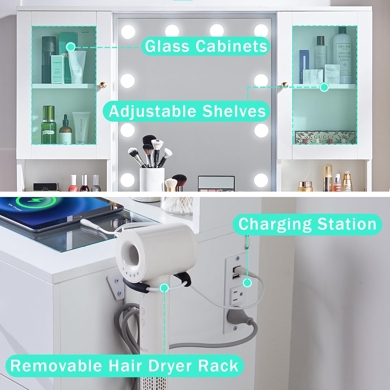 * HIGH-QUALITY MATERIALS: This classic modern vanity is made of quality MDF wood, silent slides, mirror and tempered glass top. The surface is scratch-resistant, waterproof, and easy to clean, built to last. The reinforced bottom provides excellent stability. In addition, our white make up vanity desk provides you with a removable metal hair dryer rack to keep your hair dryer and hair curler within arm’s reach. The size of the glass top makeup vanity is 47.2″ L X 55″ H X 15.6″ W, larger size.