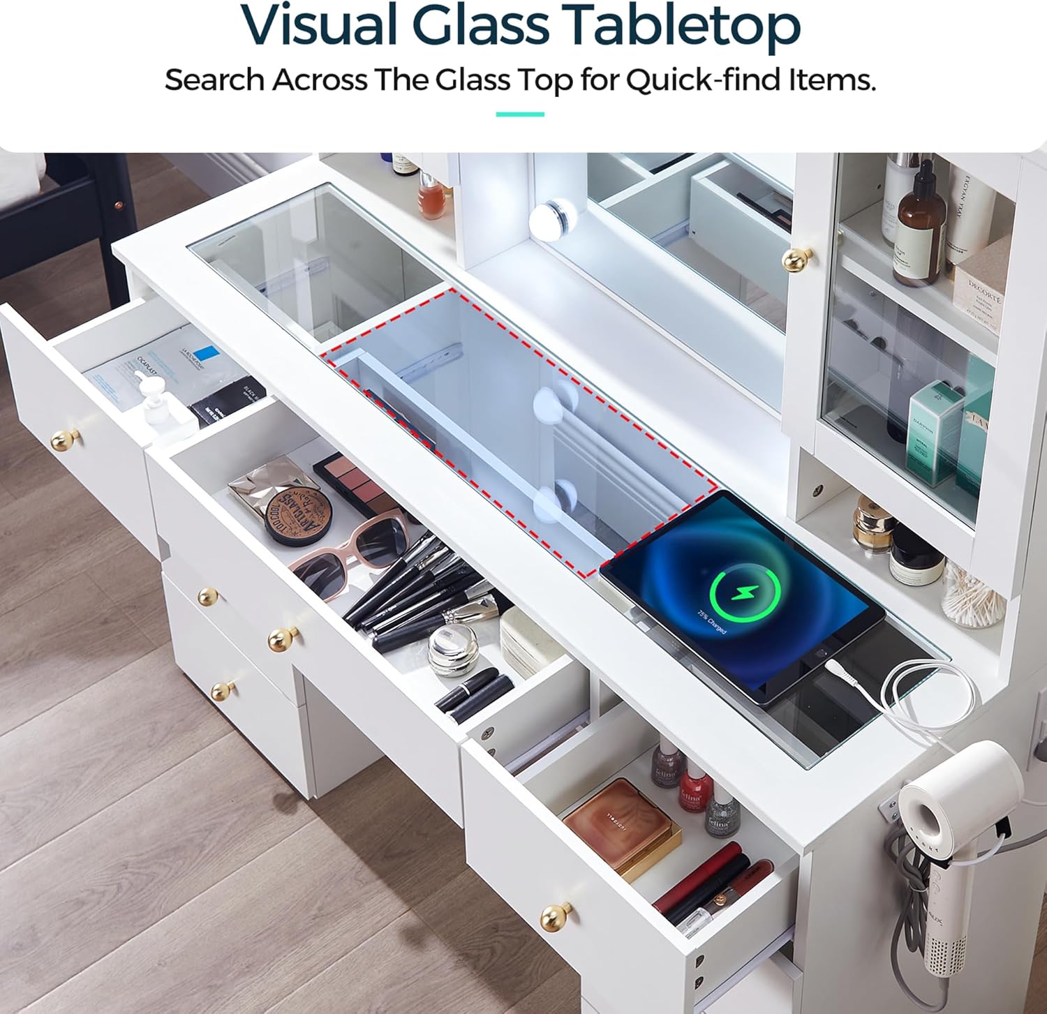 * GLASS TOP VANITY: With comprehensive functionality and elegant appearance, the white vanity with storage features a distinctive HD tempered glass table top, allowing for a clear view of the beauty tools and items stored in the drawers. This design makes it easier to enjoy or find your accessories while preventing oxidation from exposure. The glass top adds a touch of luxury while also being easy to clean and maintain, making the makeup vanity perfect for organizing your cosmetics and jewelry.