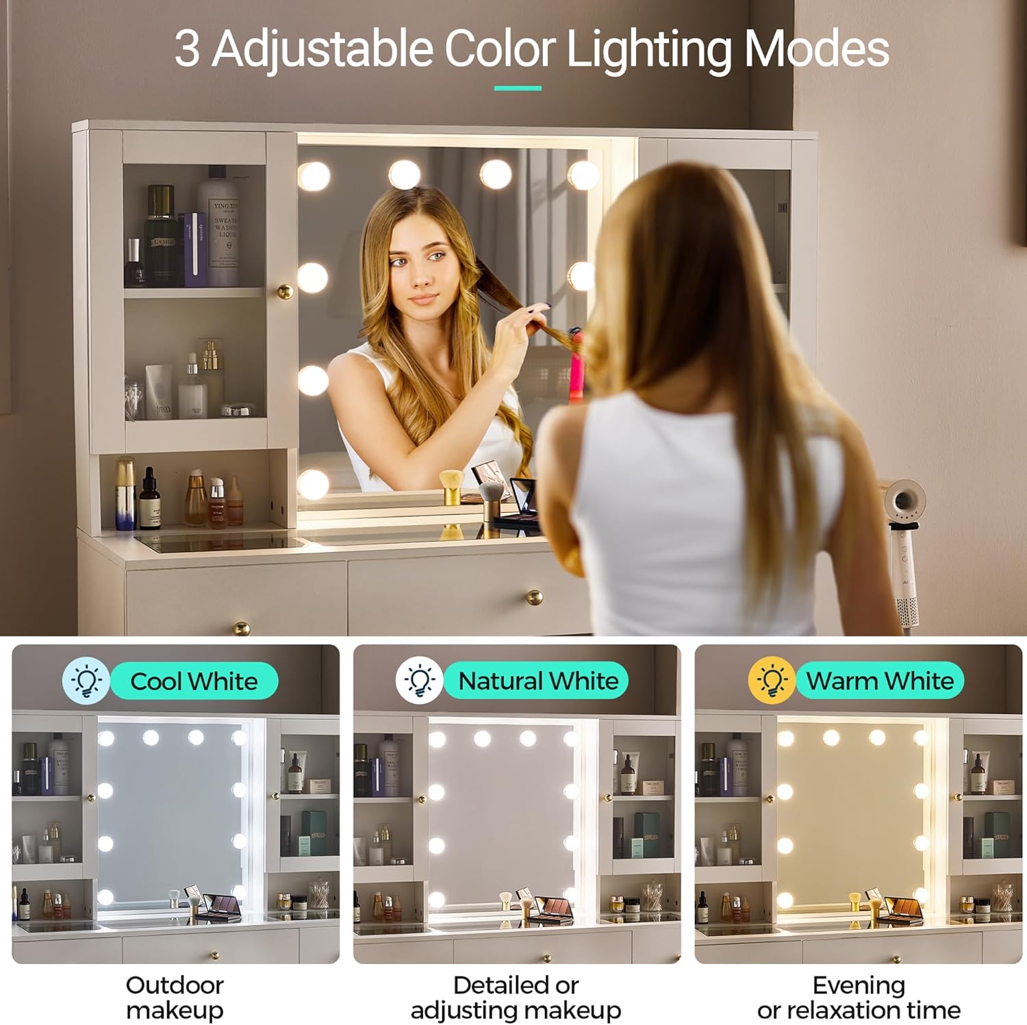 * LIGHTING & CHARGING STATION: 10 LED light bulbs surrounds the large and clear mirror, 3 adjustable lighting modes: cold light, natural light and warm light. Long-pressing the switch can change the lighting color. Whether for makeup application, skincare, live broadcast, or creating a relaxing atmosphere, this vanity mirror meets all your needs. This vanity has a built-in charging station with 2 power outlets and 2 USB ports, making it easy to use hair dryers or charge mobile devices.